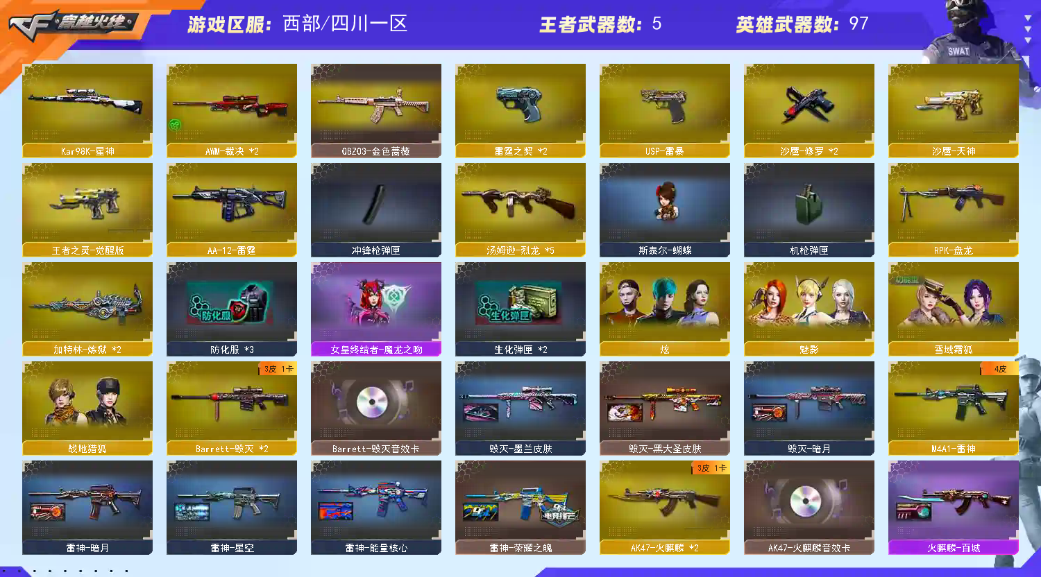 【98k星神+usp雷暴 】【5烈龙 盘龙 炼狱*2 斯太尔蝴蝶 】【qbz金色蔷薇】【火麒麟+卡+even】【黑龙】【雷神+荣耀之魄】【黑骑士+卡+白马银枪】【毁灭+卡】【裁决 】【雷暴套 】【武器:雷霆 雷暴 王者之魄 王者之势 海王】【7手枪:修罗*2 天神 雷霆*2 雷暴 王者之灵 】【8刀具:屠龙*3 擎天 尼泊尔雷霆 斩神刀雷暴 麒麟刺堕天神 】【13雷套:雷霆雷*7 雷暴雷*5 】【小人枪:】【音效卡:毁灭音效卡 黑骑士音效卡 火麒麟音效卡 】【角色:炫 魅影 战地猎狐 】;USP-雷暴,RPK-盘龙,QBZ03-金色蔷薇,Kar98K-星神,