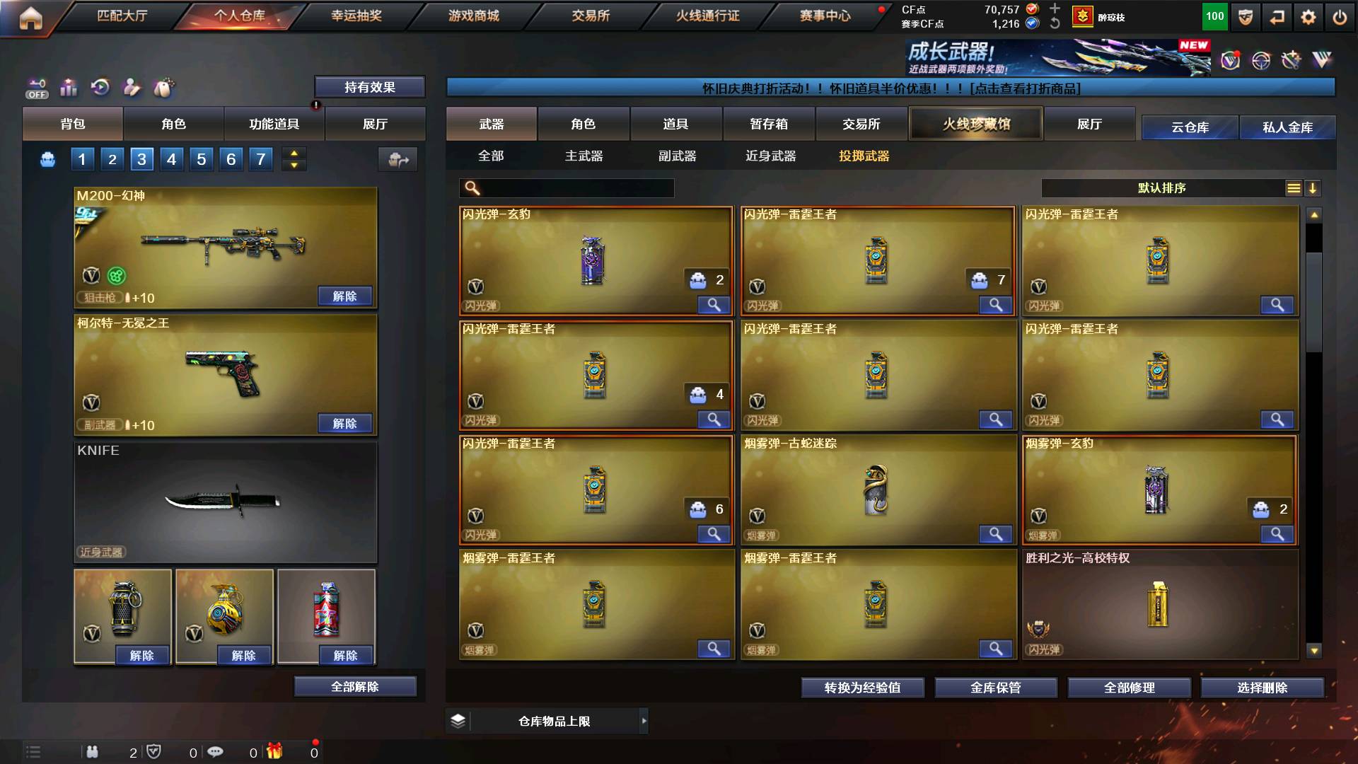 毁号必究!!!!!!!!!!!!!!!!! 极品爆破全装号幻神三件套,裁决三件套,qbz三件套。星神。四防王者春,王者影豹,四防暗夜审判。冠军之幻,cfs2022。qbz2024。白虎百战金芒。雷神荣耀。4柯尔特1USP雷暴3COP。七套雷,全粉烟紫烟。天启悦智。;USP-雷暴,炽芒蝶刃,QBZ03-金色蔷薇,M200-幻神,Scar Light-白虎,Kar98K-星神,