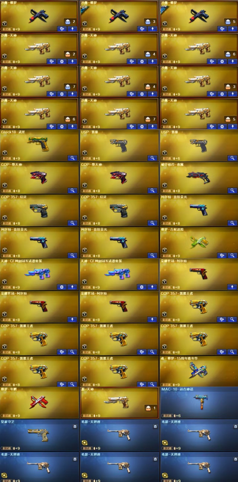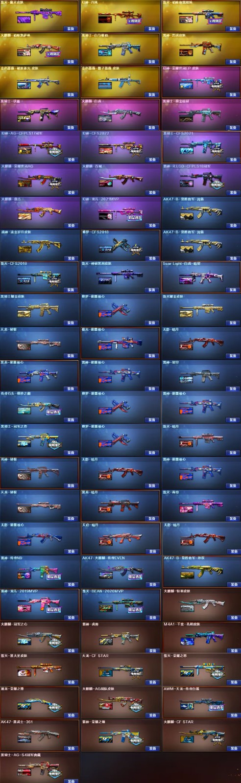 【王者武器】:【炫金天龙-3,炫金武士-1,王者之幻-1,炫金黑龙-2,炫金雷神-1,炫金毁灭-2,王者之翼-1,王者之锋-2,天启-悦智-1,烟雾弹-雷霆王者-2,王者凤吟-2,闪光弹-雷霆王者-1,王者之魄高爆手雷-2,高爆手雷-雷霆王者-1,王者之魄闪光弹-4,王者之魄烟雾弹-2,Barrett-雷霆王者-1,COP 357-雷霆王者-觉醒版-6,QBZ-03-王者蔷薇-觉醒版-1,炼狱-悦蓝-觉醒版-1,王者之光-觉醒版-1,王者之决-觉醒版-1,王者之击-觉醒版-3,王者之力-觉醒版-1,王者之啸-觉醒版-1,王者之幻-觉醒版-1,王者之影-觉醒版-1,王者之心-觉醒版-2,王者之烈-觉醒版-1,王者之锋-觉醒版-1,王者之魄-觉醒版-1,王者幻神-觉醒版-2,王者星神-觉醒版-1,王者白虎-觉醒版-1,炫金骑士-1,炫金超新星-1】 【英雄武器】:【M4A1-死神-2,AK12-天启-1,M4A1-武圣-3,AN94-超新星-4,M4A1-千变-2,M4A1-黑骑士-3,M4A1-玫瑰精灵-1,AK47-黑武士-1,屠龙-8,AK47-机械迷城-1,龙啸-1,麒麟刺-4,AK47-火麒麟-4,AWM-天龙-1,Barrett-毁灭-6,汤姆逊-烈龙-6,Barrett-极光-2,RPK-盘龙-5,沙鹰-修罗-3,加特林-炼狱-6,沙鹰-天神-9,Glock18-武圣-1,M4A1-雷神-5,M4A1-黑龙-3,9A91-烈火-3,M200-幻神-1,USP-雷暴-2,高爆手雷-雷暴-7,黑武士-CF网剧冠军-2,烟雾弹-雷霆-1,闪光弹-雷霆-1,闪光弹-雷暴-7,烟雾弹-雷暴-7,斩神刀-雷暴-1,M200-竞技荣光-2,天神-CF网剧冠军-2,幻灵之锋-1,擎天-CF网剧冠军-2,擎天-竞技荣光-2,柯尔特-竞技荣光-3,烟雾弹-竞技荣光-8,闪光弹-竞技荣光-9,高爆手雷-竞技荣光-9,M4A1-夜魔-1,Scar Light-白虎-2,传说暗裔-1,传说光耀-1,高爆手雷-夜魔-7,马来剑-夜魔-1,破空枪刃-夜魔-1,闪光弹-夜魔-7,烟雾弹-夜魔-7,炽芒蝶刃-3,高爆手雷-雷霆-1,AK-47-猩红传说-1,AA-12-雷霆-1,Barrett-暗月传说-2,QBZ03-金色蔷薇-3,八面凌龙-1,HK417-朱雀-1,G36C-幻影-1,Kar98K-星神-1,擎天-3,M4A1-堕天神-1,COP-堕天神-2,AWM-裁决-1,高爆手雷-堕天神-7,龙啸-堕天神-2,麒麟刺-堕天神-2,闪光弹-堕天神-7,烟雾弹-堕天神-7,AK47-雷暴-1,AK47-B-常胜将军-1,AK47-B-身先士卒-1,COP 357-幻灵-2,M4A1-幻灵-1,传说梦魇-1,烟雾弹-幻灵-6,荣耀世冠-柯尔特-3,荣耀世冠-火麒麟-2,荣耀世冠-雷神-2,荣耀世冠-龙啸-1,闪光弹-幻灵-6,雷霆之锋-1,高爆手雷-幻灵-5,黑骑士-海王-1,AK47-黑鲨-3,AK47-B-战士-1,M4A1-龙血-1,Barrett-朱雀-1】 【装饰品】:【火麒麟-CF STAR-1,天龙-CF STAR-1,修罗-CF STAR-1,天龙-秘银-1,死神-秘银-1,黑龙-暗月-1,天启-暗月-1,无影-暗月-1,毁灭-暗月-1,雷神-能量核心-1,黑龙-能量核心-1,无影-能量核心-1,极光-能量核心-1,修罗-能量核心-1,兔子泰迪娃娃-1,AWM-天龙-传奇白鲨-1,火麒麟-冠军之心-1,雷神-宇航兔皮肤-1,雷神-机甲刑天皮肤-1,雷神-荣耀世冠AG-1,雷神-烈虎皮肤-1,雷神-R.LGD-CFPLS18冠军-1,毁灭-冠军之怒-1,雷神-宠儿-2019MVP-1,哪吒玩偶-1,M4A1-雷神-CFS 2019-1,M4A1-千变-孔明皮肤-1,AK47-火麒麟-传奇EVEN-1,传奇石头-横秒之巅-1,火麒麟-盘古-1,火麒麟-白虎-1,火麒麟-荣耀世冠AG-1,火麒麟-百城-1,AK47-黑武士-361-1,火麒麟-巅峰荣耀-1,雷神-虎将-1,火麒麟-轻羽皮肤-1,黑骑士-摸金校尉-1,黑骑士-AG-S4冠军典藏-1,黑骑士耀金皮肤-1,黑骑士-伏羲-1,雷神-星空-1,黑骑士-CFS2021-1,黑骑士-冠军之势-1,Scar Light-白虎-暗星-1,战神-流金岁月皮肤-1,AK47-B-常胜将军-刘备-1,AK47-B-常胜将军-孙权-1,屠龙-荣耀之锋-1,雷神-荣耀之魄-1,毁灭-荣耀之怒-1,毁灭耀金皮肤-1,幻神-CFS2022-1,幻神-宠儿-2021MVP-1,幻神-青鹤-1,幻神-丹凤-1,幻神-AG-CFPLS17冠军-1,幻神-冠军之幻-1,幻神-周瑜皮肤-1,屠龙-荣耀世冠AG-1,幻神-荣耀世冠EP皮肤-1,毁灭-神秘黑洞皮肤-1,毁灭-魔灵皮肤-1,毁灭-黑大圣皮肤-1,毁灭-BEAN-2020MVP-1,金色蔷薇-破浪逐光 皮肤-1,毁灭-CFS2020-1,金色蔷薇-量子蔷薇 皮肤-1,雷神-冠军之魄-1,龙啸-冠军之啸-1,CFS 击杀图标-1,绝迹语音包-1,雷神-传奇N9-1,零-水下丽影玩偶-1】 【角色】:【金戈,樱,瞳,葵,零,堕天使,复仇者,幻影,飞虎队,猎狐者,G.E.M.邓紫棋,夜玫瑰,活力灵狐,灵狐者,传说女帝,春,嘉年华灵狐,潘多拉-锋芒精英,雪莉杨-摸金校尉,炫,威锋,救世主,王力宏,灵狐者-黄金海岸,月兔特工,鹰,电竞教官-云悠悠,影豹,雨棠,王者凌霄,王者玲珑-小乔,王者-迷迭香,王者-瞳-闭月羞花,王者葵-惊若翩鸿,王者-救世主,夜玫瑰-X,圣诞潘多拉-X,救世主-X,剑齿虎-X,风暴女,凌霄,陈龙野-Y,精英部队,烈锋,猎狐者-X,斯沃特精英,新灵狐者,研,狐妖儿,空,王者-零-传说之路,潘多拉-甜心教官,新娜塔莎,龙儿,紫霞,娜塔莎,剑齿虎,麻雀,炽天使,王者-葵-貂蝉,王者-魅影,芳心审判者,王者-春,社长刀锋,暗夜-X,迷迭香,零—热舞青春,灵狐者-职业经理,王者玲珑,樱-青春偶像,青霞仙子,职业选手,王者-零,妲己,幽,葵-赛博朋克】 【道具】:【超级背包-1,炫彩背包-1,烟雾保护头盔-1,闪光护目镜-1,防弹头盔-1,手雷包-1,C4工具钳-1,变异宝贝-1,灵魂忍者-1,迷雾幽灵-1,冲锋枪弹匣-1,M4A1-雷神 紫橙光效-1,C4-红龙-1,Barrett-毁灭音效卡-1,AK47-火麒麟音效卡-1,M4A1-黑骑士音效卡-1,Barrett-极光音效卡-1,M200-幻神音效卡-1,M4A1-黑龙音效卡-1,QBZ03-金色蔷薇音效卡-1,Scar Light-白虎音效卡-1,背包-洛丽塔-1,天使之翼-1,绿色巨人-1,Kar98K-星神音效卡-1,超级护目镜-1,AWM-裁决音效卡-1】;USP-雷暴,荣耀世冠-柯尔特,炽芒蝶刃,传说女帝,电竞教官-云悠悠,妮妮,RPK-盘龙,