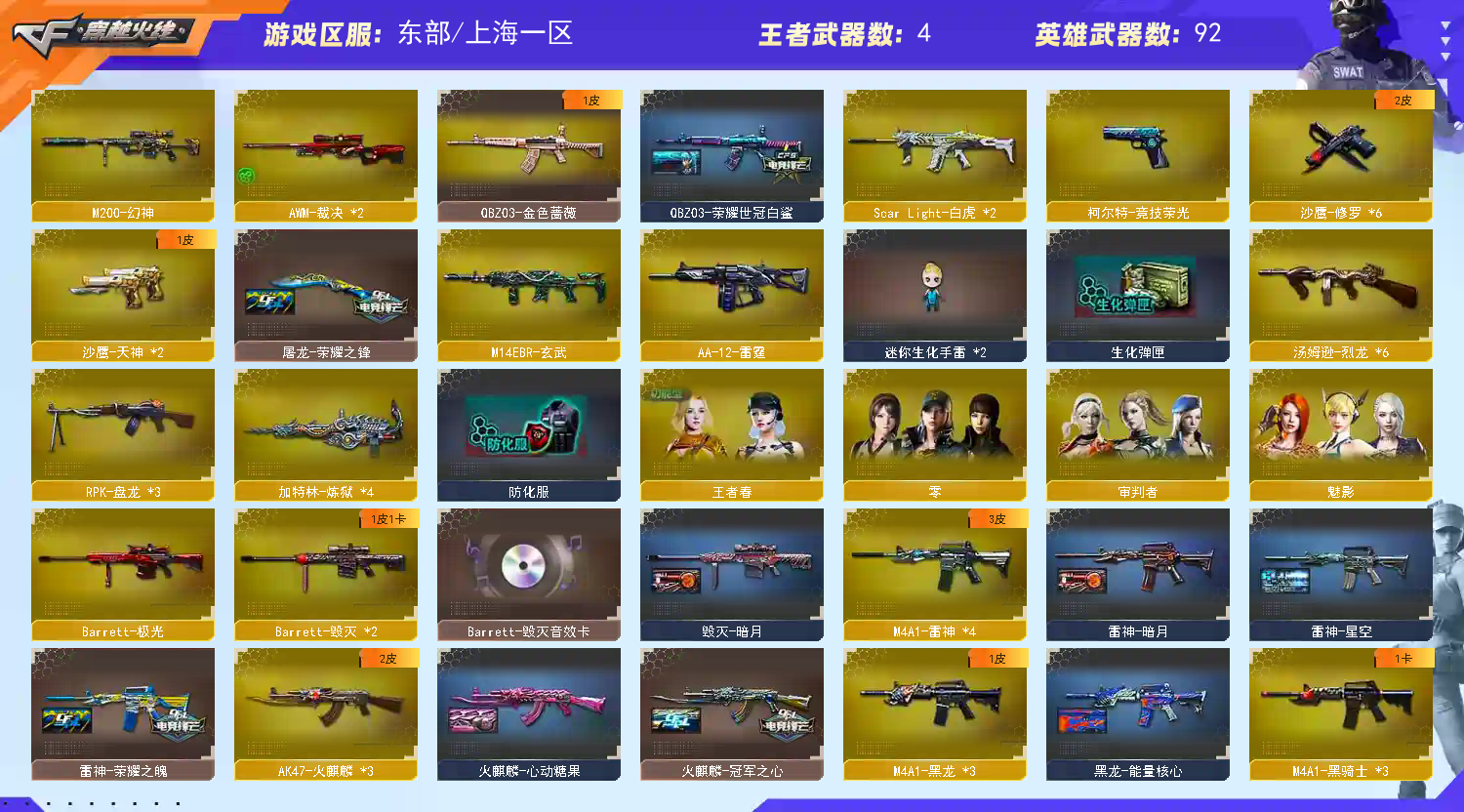 幻神,白虎,QBZ+白鲨皮肤,雷神荣耀,6烈龙,柯尔特竞技荣光