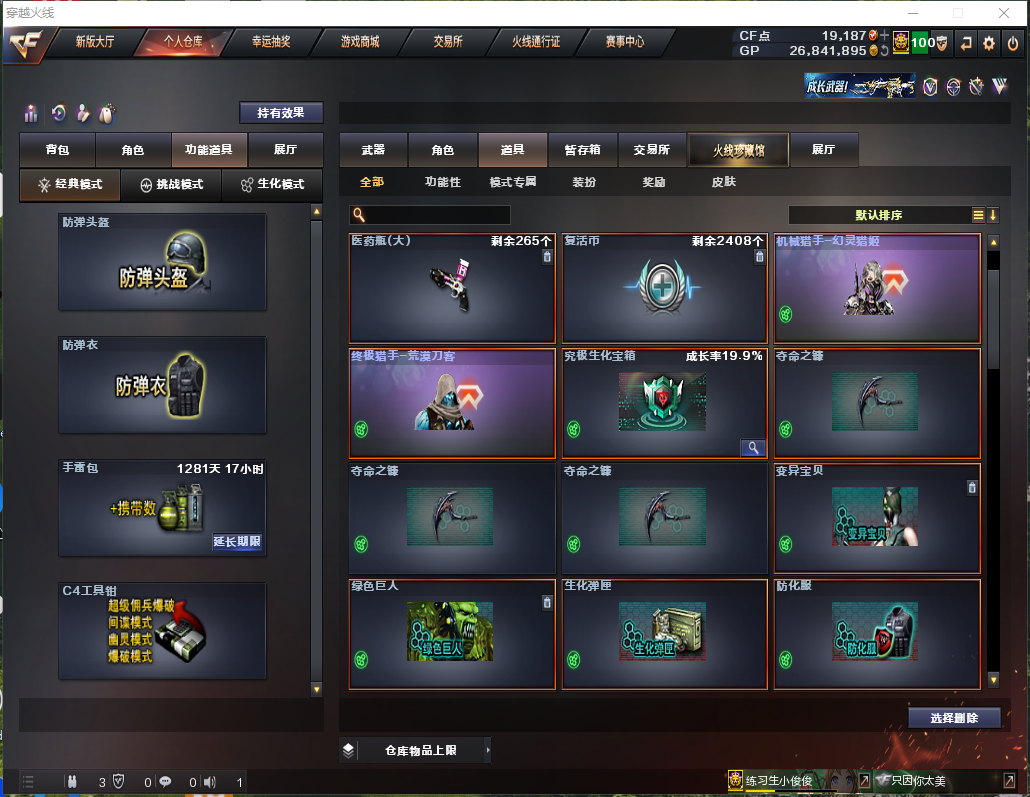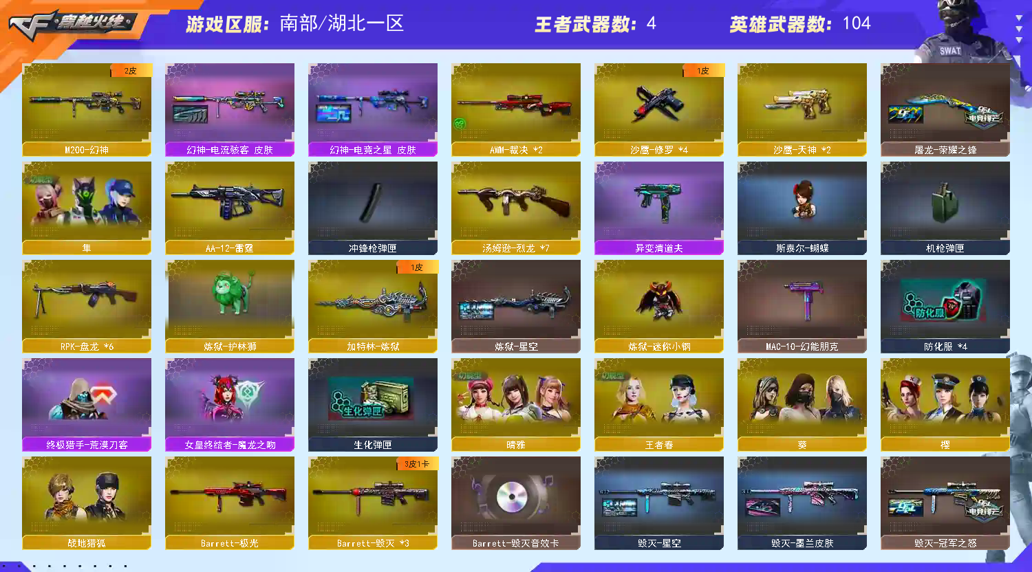 【主武器】炼狱护林狮/M200-幻神/朱雀/M4雷霆/金色蔷薇-古蛇迷踪/斯太尔蝴蝶/炼狱/异变清道夫/KAC狂怒咆哮/⑥烈龙⑥盘龙/千变/2火麒麟/3雷神/2黑骑士/无影/死神/黑武士/天启/武圣/3龙血/玫瑰精灵/猎神/烈火/烈火动感闪耀/王者之势绝续/2天龙/3毁灭/极光/2裁决/朱雀炮/王者之怒觉醒/aa12雷霆/朱雀蛇隐宗/雷神精英刀锋/炼狱小刚/炫金黑龙/炫金雷神/炫金骑士/炫金武士/黑龙吞噬者/冰龙/激光毁灭者3/巴雷特赏金猎人/EVO赤血龙魂 【副武器】COP-白鲨/王者之魂觉醒/4修罗/2天神/天神动感闪耀/修罗-古蛇迷踪/cop旗袍/3涂鸦手枪 【近身武器】黄金猫猫手套白鲨/迷你钢铁终结者/迷你救赎猎手/⑤屠龙/⑨龙啸/麒麟刺/尼泊尔雷霆/斩神刀雷暴/唐刀神功天巧/屠龙动感闪耀/金刚伞/冰龙/2手斧镜/ 【投掷武器】②迷你生化手雷/3高爆雷暴+烟闪/高爆雷霆+烟闪/2高爆神功天巧+烟闪/手雷动感闪耀/高爆古蛇迷踪/ 【角色】隼+生化四防/晴雅+四防/王者春+四防/乔伊教练/葵/樱/蛇隐宗/炽天使/空/灵狐者黄金海岸/零水下丽影/兰海滩派对/对讲机/炫彩背包 【皮肤】幻神-电流骇客皮肤/擎天-冠军之击皮肤/毁灭-冠军之怒皮肤/屠龙-荣耀之峰皮肤/炼狱星空皮肤/修罗-15周年皮肤/黑骑士-耀金皮肤/修罗-星空皮肤/毁灭-星空皮肤/火麒麟AG战队皮肤/天龙传奇白鲨皮肤/雷神动感闪耀皮肤/ 【音效卡】火麒麟音效卡/毁灭音效卡 【道具】紫金大元首/全背包/VIP6/步枪/冲锋枪/狙击枪/机枪/生化弹夹/变异宝贝/绿巨人/终极猎手荒漠刀客皮肤/机械猎手幻灵猎姬皮肤/生化爆破全装;隼,晴雅,RPK-盘龙,M200-幻神,