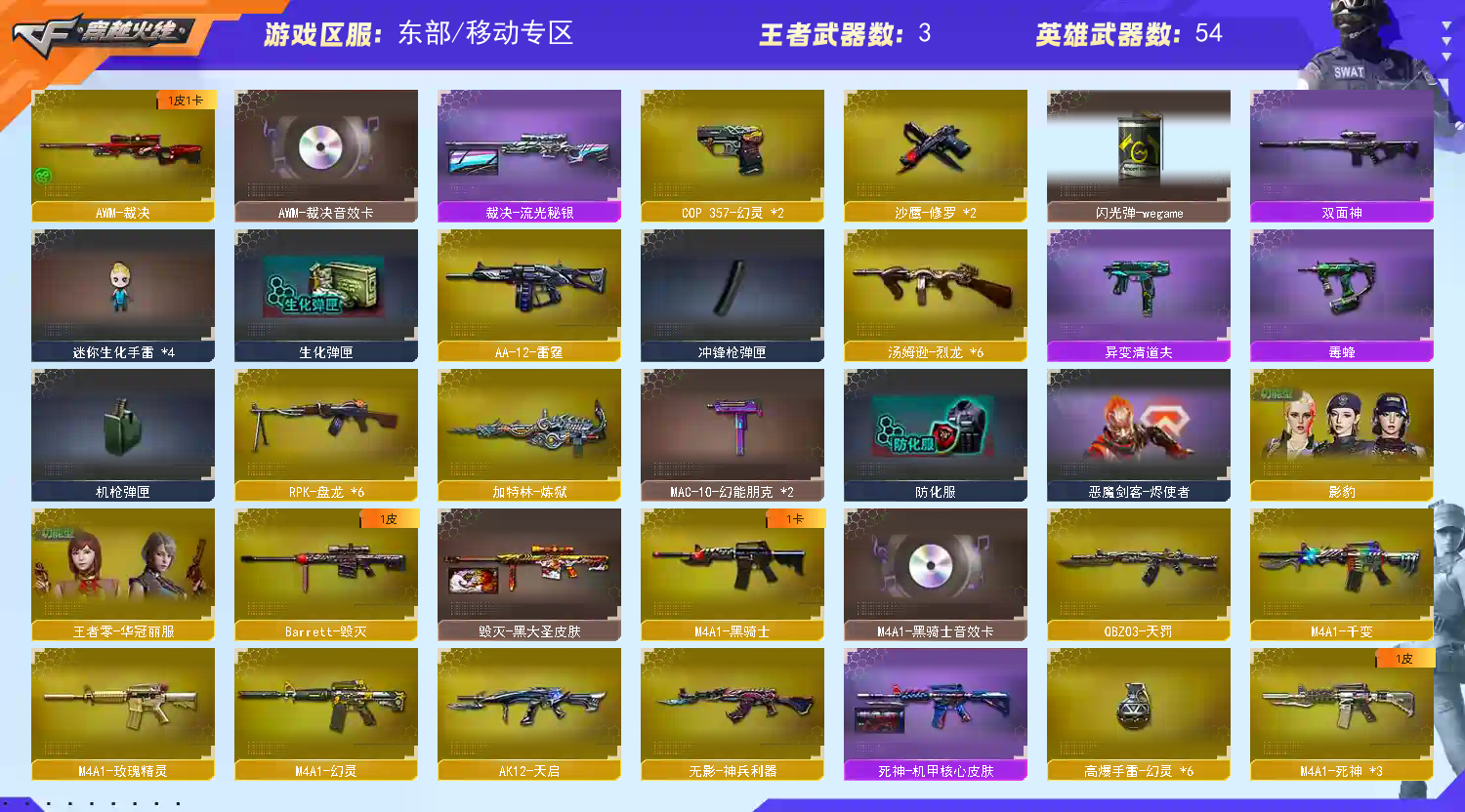 角色:4防影豹 四防王者零-华冠丽服 4防铁扇公主-暗灵 不好找请用搜索 生化英雄皮肤:时空猎手-幻影猎人 武器:六盘六烈 加特林-炼狱 毒峰 M4A1-幻灵 异变清道夫 双面神 迷你生化手雷*4 道具:伪装幽灵 变异宝贝 灵魂忍者 防护服 生化弹夹 机枪弹夹 冲峰枪弹夹 超级对讲机 猫耳头盔 超级护目镜 夺命之镰 防弹衣 防弹帽 挑战:可装备7挑战暴击加成玩偶 QBZ03-天罚 集束激光-超越MAX(3+3) 火狱乱世(3+3)毁灭征服者(3+3) 惩戒者Ⅲ 试练破坏者Ⅲ 未日审判者Ⅲ 机甲撕裂者Ⅲ 神圣爆裂者Ⅲ 阐释者Ⅲ 激光毁灭者Ⅲ*3 深渊巨龙咆哮Ⅲ;RPK-盘龙,