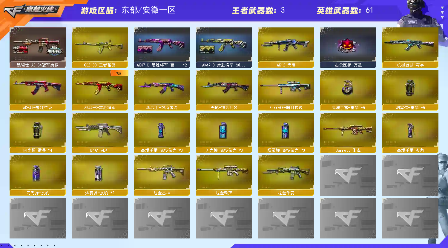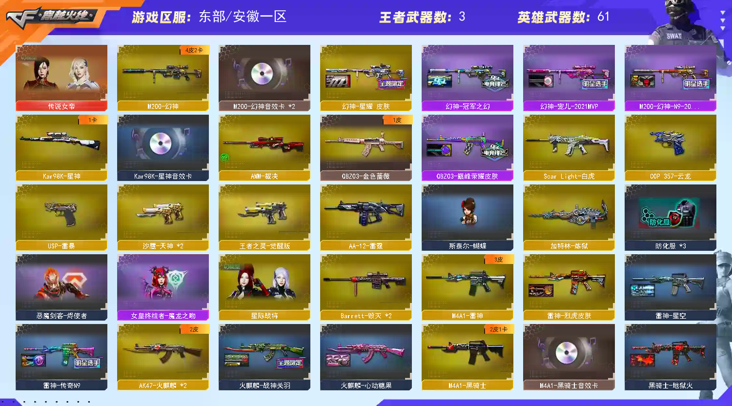 【V武器数63】【幻神三件套】【幻神4皮】【斯泰尔-蝴蝶】【雷暴套装X5套】【竞技荣光套装X3套】【传说女帝】【M200-幻神】【幻神-星耀 皮肤】【幻神-宠儿-2021MVP】【幻神-冠军之幻】【M200-幻神-N9-2022MVP】【M200-幻神音效卡】【Kar98K-星神】【Kar98K-星神音效卡】【AWM-裁决】【Scar Light-白虎】【QBZ03-金色蔷薇】【QBZ03-巅峰荣耀皮肤】【QBZ-03-王者蔷薇】【USP-雷暴】【COP 357-云龙】【丛林匕首-玄豹】【加特林-炼狱】【斯泰尔-蝴蝶】【传说女帝】【奇洋探员】【星际战将】【M4A1-雷神】【雷神-传奇N9】【雷神-烈虎皮肤】【雷神-星空】【AK47-火麒麟】【火麒麟-战神关羽】【火麒麟-心动糖果】【火麒麟-CFSTAR】【火麒麟-雷神】【M4A1-黑骑士】【黑骑士-地狱火】【黑骑士-AG-S4冠军典藏】【M4A1-黑骑士音效卡】【Barrett-毁灭】;USP-雷暴,传说女帝,QBZ03-金色蔷薇,M200-幻神,Scar Light-白虎,Kar98K-星神,