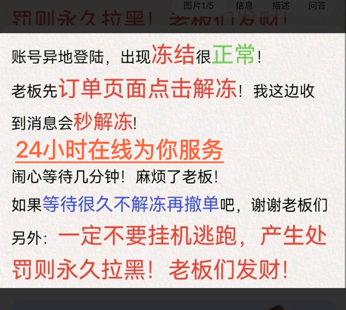 哥姐们~~~冻结点解冻,需要一键验证的发送短信联系我们 喜 欢加收藏,老弟祝各位哥哥姐姐发大财 发完短信耐心等待3分钟重启游戏即可小本买卖,炸鱼轻点恶意退排位恶意无理由撤单一律黑名单 [店铺所有账号均于成都市网监局备案虚拟财产,开挂/鼠标宏/恶 意卡BUG等毁号行为,直接联合本平台提供详细信息邮寄律师函!必追责原价赔偿!;