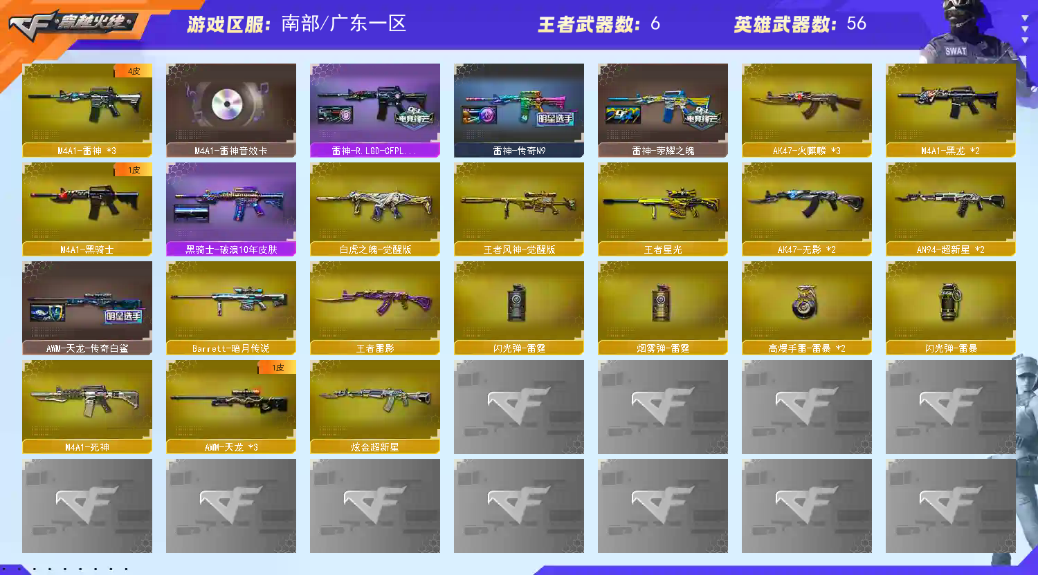 【传说夜影+传说幽冥】【M200-幻神+幻神-荣耀世冠白鲨2023】【Kar98K-星神+音效卡+枪娘默】【王者风神】【g36c幻影】【白虎之魄】【QBZ03-金色蔷薇+冠军之薇+传奇宠儿】【裁决+异化之源+流光秘银】【毁灭+毁灭-荣耀之怒】【极光】【火麒麟+火麒麟-枪娘】【黑龙】【雷神+音效卡+雷神-lgd18冠军+雷神-传奇n9+雷神-白鲨14冠军】【黑骑士】【无影 超新星 】【8手枪 天神*5 柯尔特荣耀世冠白鲨2023 冠军之特】【8近战 屠龙*5 麒麟刺*3】【四防 王者沙漠玫瑰】;柯尔特-荣耀世冠白鲨2023,传说幽冥,柯尔特-冠军之特,隼,王者沙漠玫瑰,QBZ03-金色蔷薇,G36C-幻影,