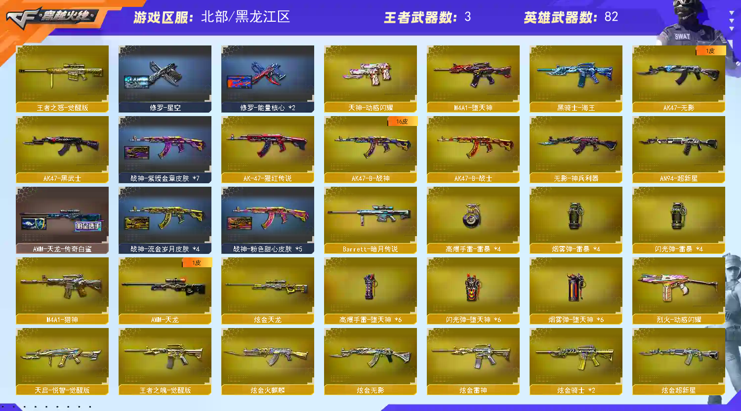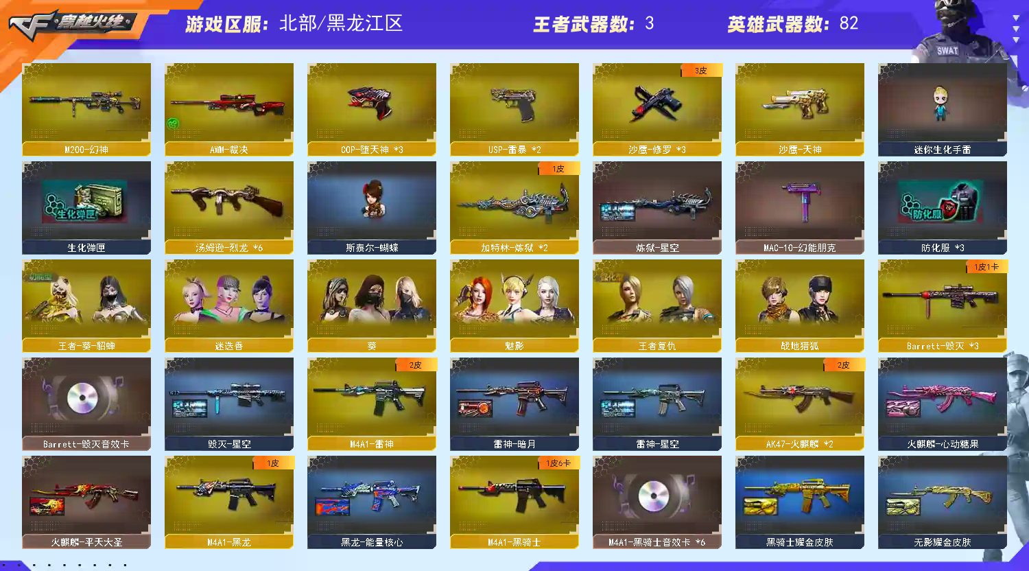 【主武】:火麒麟2、天龙、盘龙、黑龙、雷神、烈龙、黑骑士、毁灭3、无影、贝雷塔、金牛座、M200幻神、苍雷、AK枪王、死神、天蝎座、黑武士、征服者、白羊座、处女座、射手座、超新星、凤凰之怒、死亡之眼、炼狱、斯泰尔巧克力、火麒麟暗月、火麒麟能量核心、黑武士暗月、黑武士能量核心、源-雷神、、魂QBZ03-金色蔷薇、M200赤血龙魂、猎神、HK417-赤血龙魂、AWM裁决、激光毁灭者3级、雷神-暗月、9A91-烈火、M4A1-雷霆、魂AA12-雷霆、AK47-雷暴、神圣爆裂者III火麒麟STAR(皮肤)、天龙STAR(皮肤毁灭耀金(皮肤)、雷神星空(皮肤)、毁灭星空(皮肤)、【副武】:沙鹰修罗2、COP、天秤座、沙鹰天神、胜利之火、、凤凰之火、Cop赤龙、、USP-雷暴3、修罗STAR(皮肤)【近身】:屠龙、龙鳞、干将莫邪、龙啸、金砖、擎天、麒麟刺、双子座、巨蟹座、屠龙-秘银、、啸天(拳套)、、斩神刀-雷暴、【投掷】:生化手雷、胜利之光、银烟、凤舞云烟、凤凰之息、雷暴套【道具】:防弹头、防弹衣、手雷包、C4工具钳、手枪弹匣、散弹弹匣、冲锋弹匣、步枪弹匣、机枪弹匣、狙击弹匣、防化服、生化弹匣、不退包、绿色巨人、疯狂宝贝、彩字、彩昵、夺命之镰、幽灵之刃、火麒麟音效卡、毁灭音效卡、雷神音效卡、天龙白鲨(皮肤)、暴躁猪玩偶、王者奎玩偶 、哪吒玩偶、护目镜、烟雾头、炫彩背包、超级背包、超级护目镜、特殊水壶、透明头盔、透明护目镜、闪光护目镜、14个背包;USP-雷暴,M200-幻神,