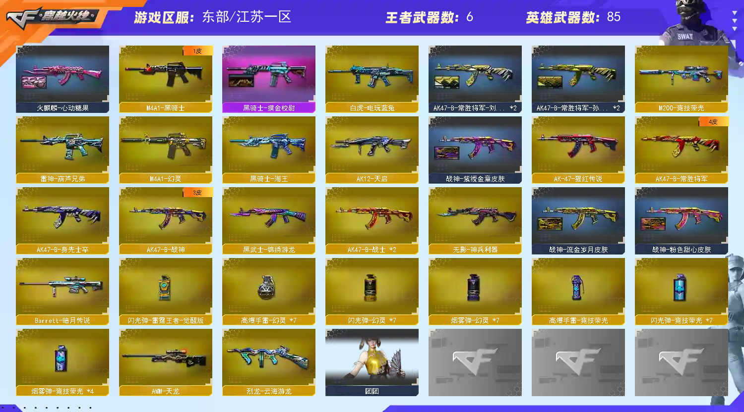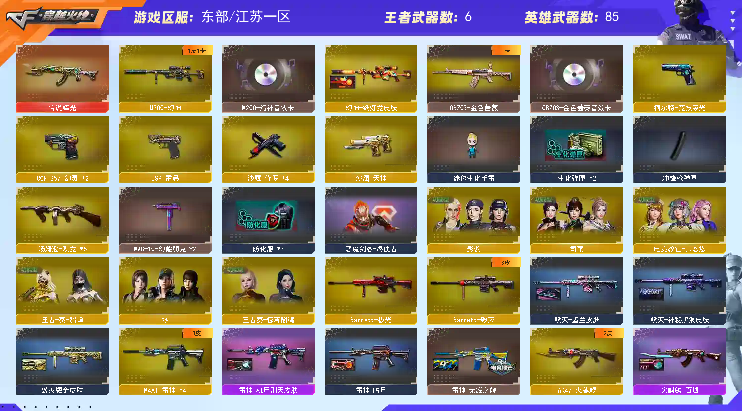 东部极品小号 【重要套装】幻灵套装/竞技荣光套装 【重要角色】_零/_影豹/电竞教官-云悠悠/司雨/蛇隐宗/蛇姬/王者-葵-貂蝉/王者葵-惊若翩鸿/幽/职业选手/云海玲珑 【传说武器】传说辉光 【英雄武器】_M200-幻神/M200-竞技荣光/Barrett-毁灭/Barrett-极光/Barrett-暗月传说/AWM-天龙/M4A1-雷神(3)/雷神-葫芦兄弟/M4A1-黑骑士/黑骑士-海王/M4A1-幻灵/白虎-电玩蓝兔/AK12-天启/AK47-火麒麟/无影-神兵利器/AK-47-猩红传说/AK47-B-身先士卒/AK47-B-常胜将军/AK47-B-战士(2)/AK47-B-战神/QBZ03-金色蔷薇/汤姆逊-烈龙(6)/COP 357-幻灵(2)/沙鹰-天神/沙鹰-修罗(4)/柯尔特-竞技荣光/USP-雷暴/王者之啸-觉醒版(2)/擎天-竞技荣光/王者之击-觉醒版/屠龙/幻灵之锋/高爆手雷-幻灵(7)/高爆手雷-竞技荣光/烟雾弹-幻灵(7)/烟雾弹-竞技荣光(4)/闪光弹-幻灵(7)/闪光弹-竞技荣光(7)/闪光弹-雷霆王者-觉醒版/超新星-热带奇洋/黑武士-锦绣游龙/烈龙-云海游龙/龙啸-热带奇洋/擎天-云海游龙/龙啸-烈火龙威/手雷-热带奇洋/手雷-云海游龙 【王者武器】 【小人枪】HK417-朱雀-蛇隐宗/雷神-小红/AWM-灵狐-15周年嘉年华(2)/真的是手枪/夺魂/迷你波特博士/迷你牛牛/生化手雷-小钢(2)/生化手雷-机甲核心/疾爆手雷-河马/深渊终结者手雷 【其他重要武器】激光毁灭者III/冰龙粉碎者-白马银枪/机甲撕裂者III/M4A1-秘银赤龙/M4A1-Guitar 炫彩/AK-47-二次元/M14EBR-炎龙/M4A1-S-十周年会/M4A1-战龙/黄金AK-47/红龙AK47/百城AK47/雷神-赛博幻想/M4A1-樱/QBZ03-吕布/雷神-赛博朋克/海浪AK47-Q浏览器/黄金AWM(2)/AWM-银月(2)/AWM-Red(2)/雷蛇AWM(2)/M200-圣诞/破天狂龙/破天九龙/M200-枪王排位/AWM-蓝水晶/Barrett-战龙/暗金AWM/暗金M200/AWM-Pink/百城AWM/M82A1-飞龙在天/AWM-T/AWM-深海猎手/M82A1-红龙/末日裁决者(2)/阿梅利轻机枪-暗夜风暴/EVO III-赤血龙魂(2)/斯泰尔-巧克力/CPW-动力-潘多拉/神圣爆裂者-末日/神圣爆裂者/Spas-12-幻能朋克/Spas-12-黑金/SPAS-12-雷电核心/修罗-年鹏/愤怒公牛左轮-枪王排位/蟒蛇-炫彩/COLT 1911-雷唤苍龙(2)/Anaconda-雷电核心/沙鹰-枪王排位/幻影Anaconda-枪王排位/幻影沙鹰-枪王排位(2)/MAC-10-幻能朋克(2)/沙鹰-青龙/新USP-枪王排位奖励(3)/COP 357-青龙/金刚伞-电玩红兔/军用铁锹-飞龙在天/收割者-枪王排位/军用铁锹-丹龙/虹光丛林匕首-枪王排位(2)/尼泊尔军刀-战龙(2)/幻影扳手-枪王排位/虹光鹰爪-枪王排位/啸天/魔能镰刀/无畏之矛/荣耀之证-枪王之王/蝴蝶刀-枪王排位/猫猫手套/虹光女皇利刃-枪王排位/幻影双斧-枪王排位/胜利奖杯手雷-枪王排位 【重要武器皮肤】幻神-纸灯龙皮肤/毁灭耀金皮肤/毁灭-墨兰皮肤/毁灭-神秘黑洞皮肤/毁灭-青帝皮肤/火麒麟-CFSTAR/火麒麟-心动糖果/火麒麟-百城/无影-能量核心/AK47-B-常胜将军-刘备/AK47-B-常胜将军-孙权/AK-47-雷神/雷神-源计划2.0专属 皮肤/雷神-荣耀之魄/雷神-暗月/雷神-机甲刑天皮肤/黑骑士-摸金校尉/战神-流金岁月皮肤/战神-紫绶金章皮肤/战神-粉色甜心皮肤/修罗-CFSTAR 【重要光效】M4A1-雷神金色光效/炼狱-悦蓝金色光效/王者之光金色光效/王者之幻金色光效/王者之魂金色光效/M4A1-雷神蓝粉色光效/Barrett-极光红绿光效/Barrett-毁灭红绿色光效/M4A1-雷神红绿光效/M4A1-黑骑士-红绿光效/M200-幻神紫橙光效/M4A1-雷神紫橙光效/AK47-火麒麟紫色光效/AK47-火麒麟绿色光效/M4A1-雷神绿色光效/屠龙蓝粉色光效/龙啸-水墨光效 【重要音效卡】AN94-超新星-热带奇洋音效卡/M200-幻神音效卡/QBZ03-金色蔷薇音效卡 【重要戒指】8周年戒2/15周年限定戒指/龙眼(死神)/龙眼(鹰)/18赛季纪念戒指-耀金/20赛季纪念戒指-耀金/21赛季纪念戒指-耀银(拇指)/22赛季纪念戒指-耀银(拇指)/23赛季纪念戒指-耀银(拇指)/23赛季纪念戒指-耀银(食指) /24赛季纪念戒指-耀银(食指) /24赛季纪念戒指-耀银(拇指)/25赛季纪念戒指-耀银(食指)/25赛季纪念戒指-耀银(拇指);USP-雷暴,电竞教官-云悠悠,QBZ03-金色蔷薇,M200-幻神,