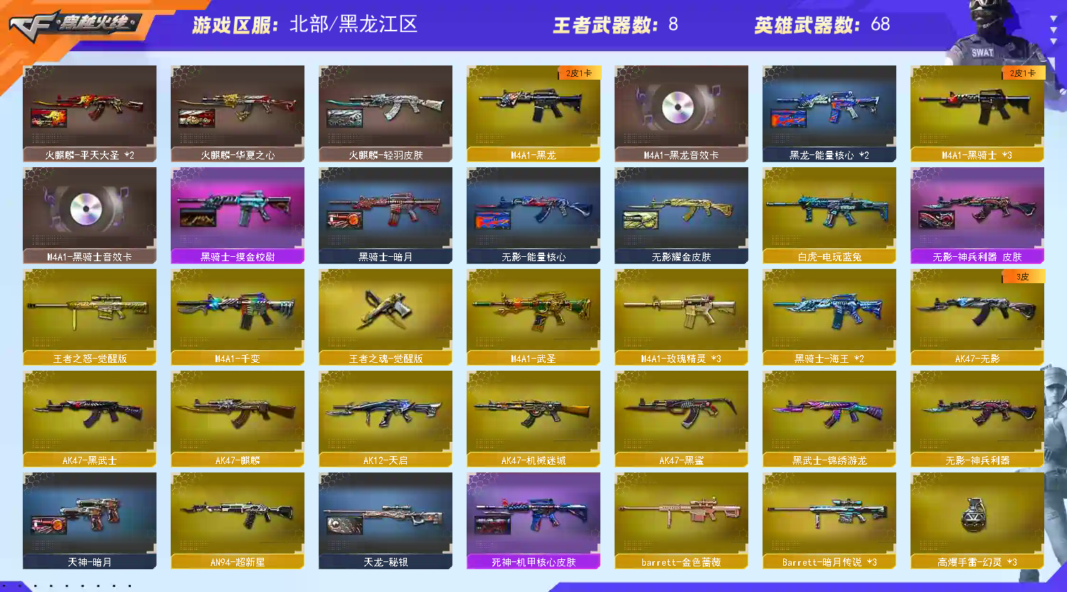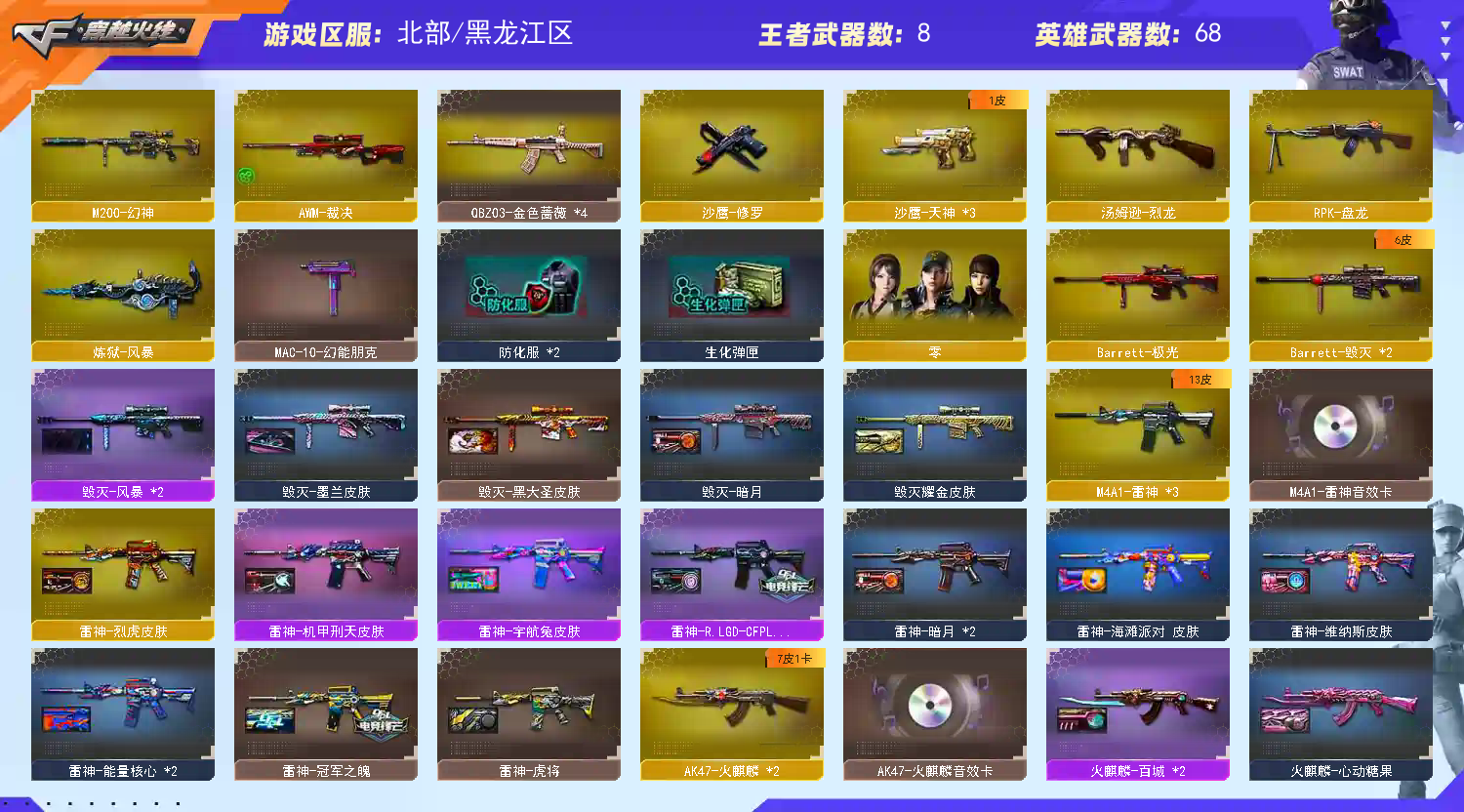 74V8王者3炫金可排位/M200-幻神/QBZ03-金色蔷薇4把/白虎-电玩蓝兔/1盘龙1炼狱1烈龙/M4A1-黑龙音效卡/M4A1-黑骑士音效卡/AK47-火麒麟音效卡/M4A1-雷神音效卡/黑骑士-白马银枪/雷神-烈虎/无影-神兵利器皮肤/雷神-机甲刑天皮肤/黑骑士-摸金校尉/毁灭-风暴/火麒麟-百城/雷神-宇航兔/死神-机甲核心/雷神-R.LGD-CFPLS18冠军/M4A1-黑骑士-娜塔莉亚/火麒麟-心动糖果/毁灭-墨兰/雷神-海滩派对/毁灭耀金皮肤/毁灭-CFS2018/无影耀金皮肤/雷神-维纳斯/火麒麟-雷神/千变-孔明/火麒麟-AG战队/火麒麟-华夏之心/火麒麟-平天大圣/毁灭-黑大圣皮肤/雷神-冠军之魄/火麒麟-轻羽/黑骑士-幻能朋克/天神-幻能朋克/火麒麟-CFSTAR/修罗-CFSTAR/天龙-CFSTAR/雷神-虎将/M4A1-雷神-精英刀锋/雷神-小红/黄金猫猫手套-白鲨/机甲撕裂者3/激光毁灭者3/王者之魄觉醒/王者之武觉醒/王者之怒觉醒/王者之魂觉醒/炫金雷神/炫金骑士/零/修道士/王者-零-传说之路/烟雾保护头盔+闪光护目镜/炫彩背包/超级背包3-7/永久防弹衣+永久防弹头盔+永久C4工具钳;RPK-盘龙,QBZ03-金色蔷薇,M200-幻神,