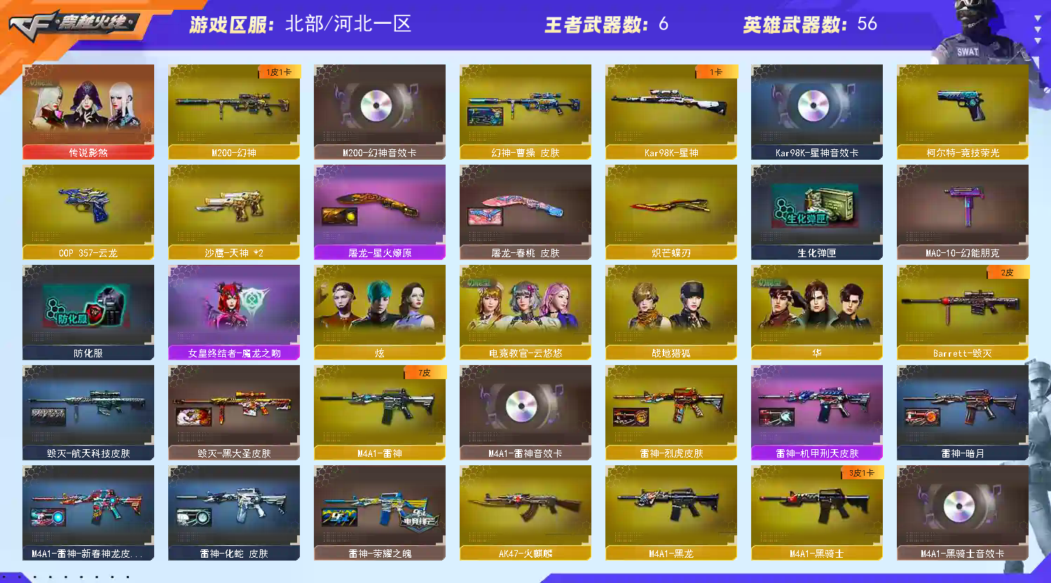 北部极品小号 【重要套装】臻选金狐套装 【重要角色】传说影煞/_炫/电竞教官-云悠悠/华/蛇隐宗/蛇姬/王者零-传说之路/电竞少女/灵狐者-职业经理/葵-赛博朋克/云海玲珑 【英雄武器】_M200-幻神/Barrett-毁灭/Barrett-暗月传说/Kar98K-星神/M4A1-雷神/M4A1-黑龙/M4A1-黑骑士/AK47-火麒麟/无影-神兵利器/AK47-B-常胜将军/QBZ03-云龙/COP 357-云龙/沙鹰-天神(2)/柯尔特-竞技荣光/云龙扇/麒麟刺/龙啸/擎天/擎天-竞技荣光/屠龙/幻灵之锋/雷霆王者之锋-觉醒版/斩神刀-雷暴/炽芒蝶刃/高爆手雷-云龙/高爆手雷-幻灵(2)/高爆手雷-雷暴/高爆手雷-堕天神/高爆手雷-竞技荣光/烟雾弹-云龙/烟雾弹-幻灵(2)/烟雾弹-雷暴/烟雾弹-堕天神/烟雾弹-雷霆王者-觉醒版/闪光弹-幻灵(2)/闪光弹-雷暴/闪光弹-堕天神/玫瑰精灵-蓝调梦幻/M4A1-凌龙-I/超新星-热带奇洋/黑武士-锦绣游龙/王者芳薇-觉醒版/Barrett-云海玲珑/烈龙-云海游龙/龙啸-热带奇洋/擎天-云海游龙 【王者武器】烟雾弹-雷霆王者/闪光弹-雷霆王者/高爆手雷-雷霆王者 【小人枪】HK417-朱雀-蛇隐宗/牛牛-AK47/沙鹰-夜玫瑰/真的是手枪/夺魂(3)/迷你曼提柯尔/迷你火种(2)/迷你深渊冰龙/迷你牛牛/迷你白狐(2)/Mini沃特X(4)/魔能飞环-曼陀罗(2)/迷你波特博士(2)/迷你裂空之翼/冰火魔兽/生化手雷-小钢/生化手雷-机甲核心(3)/疾爆手雷-河马/烟雾弹-Orange-虎牙娘/闪光弹-小乔/高爆手雷-大乔/闪光弹-貂蝉 【其他重要武器】火麒麟-能量核心/冰龙粉碎者-白马银枪/激光毁灭者III-白马银枪(2)/机甲撕裂者III/AK47-死亡之翼/AN94-青花瓷(2)/AK-47-红龙/XM8-炫彩(2)/M14EBR-赤血龙魂/M4A1-电音(2)/M14EBR-天羽/M4A1-Guitar 炫彩/AK47-狂欢-CFS/M4A1-狂欢-CFS/QBZ03-锋芒破茧/M14EBR-炎龙/AK47-雷蛇/M4A1-S-十周年会(2)/M4A1-PINK/9A-91翡翠/QBZ03-吕布(3)/AK-12-CFS2017纪念版/M4A1-战龙/百城M4A1/红龙AK47/AK47-破空冰刃/AK47-丹龙/AK47-盛典-CFS 2022/AK47-苍龙/M4A1-S-能量核心/M4A1-紫炎/AT15-万圣节/M4A1-S-火种/M4A1-XS-耀龙/AK-47-二次元/G3A3-SS-枪王排位/AK103-神秘黑洞/AK47-轮回/M4CQBR-AP-孔明/深海AK47-Q管家/M4A1C-死亡之翼/AK47-齐天大圣/百城AK47/M4A1枪王排位II/9A-91-圣诞/AK-103-火线13周年/黄金AK-47/神罚/AWM-恶棍-枪王排位(2)/M82A1-水枪-机甲核心/98K-烛龙/Barrett-炎龙/M200-圣诞/AWM-圣诞2013/M200-庆典-CFS 2021/雷蛇AWM/Barrett-麟龙/Barrett-翔龙/M200-朋克/M82A1-青龙/破天狂龙/M82A1-飞龙在天/AWM-枪娘/FN弩炮-CFS2017纪念版/AWM-小故障/M200 CheyTac-大圣/百城AWM/AWM-Red/Barrett-耀龙/AWM-盛典-CFS 2022/蓝色魅影/M200-大黄蜂(2)/M82A1-红龙/AWM-蓝水晶/Barrett-孔明/M200-萌杀/M200-落樱/98K-火线13周年/AWM-摸金校尉/M200-青帝/AWM-A枪王排位II/AWM-Pink/AWM-A-圣诞2021/Barrett-怒火大圣/AWM-万圣节刀锋/末日裁决者(2)/雷蛇加特林(2)/M240B-卡通/KAC-情人节2021/KAC-耀龙/CPW-动力-潘多拉(2)/EVOⅢ-黑金传说/EVO III-赤血龙魂/MK5-枪王排位/斯泰尔-CFS2017纪念版/神圣爆裂者-末日/试炼破坏者III/AA12-擎天柱(2)/神圣爆裂者/Spas-12-幻能朋克/Spas-12-黑金/SPAS-12-雷电核心(3)/Anaconda-麟龙/新USP-枪王排位奖励(3)/蟒蛇-炫彩/幻影Anaconda-枪王排位(2)/COP-金蝉子-枪王排位(3)/COP357-朋克/Colt1911-彩蝶(2)/愤怒公牛左轮-枪王排位(2)/COP357-十二生肖·羊/沙漠之鹰-炎龙/愤怒公牛左轮-丹龙/Anaconda-雷电核心/USP-黑大圣(3)/幻影沙鹰-枪王排位/沙鹰-枪王排位(2)/COP-机甲刑天/愤怒的公牛-朋克/MAC-10-幻能朋克/COP 357-青龙/迷彩沙鹰-70KG/毛瑟-庆典-CFS 2021/Anaconda-情人节2021/COP357-绚樱-圣诞/收割者-枪王排位/虹光丛林匕首-枪王排位/尼泊尔-炎龙/军用铁锹-丹龙/虹光鹰爪-枪王排位(2)/尼泊尔-庆典-CFS 2021/蝴蝶刀-枪王排位/匕首-幻能朋克/猫猫手套/幻影扳手-枪王排位/幻影双斧-枪王排位/尼泊尔军刀-战龙/鹰爪-枪王排位/雷神之怒-机甲核心/斩神刀-青帝/军用手斧-能量核心/啸天/丛林匕首-卧龙/魔能镰刀/斩魔刀-怒火大圣/胜利奖杯闪光弹-枪王排位(4)/胜利奖杯手雷-枪王排位(4)/胜利奖杯烟雾弹-枪王排位(3)/闪光弹-枪王排位(4) 【重要武器皮肤】幻神-曹操 皮肤/毁灭-虹光风暴 皮肤/毁灭-黑大圣皮肤/毁灭-青帝皮肤/毁灭-航天科技皮肤/毁灭-秦师 皮肤/火麒麟-CFSTAR/AK47-B-常胜将军-刘备/AK47-B-常胜将军-孙权/AK47-B-常胜将军-曹操/雷神-化蛇 皮肤/雷神-源计划2.0专属 皮肤/雷神-荣耀之魄/雷神-暗月/雷神-机甲刑天皮肤/雷神-烈虎皮肤/M4A1-雷神-新春神龙皮肤/黑骑士-破界 皮肤/黑骑士-破浪10年皮肤/黑骑士-摸金校尉/战神-流金岁月皮肤/战神-粉色甜心皮肤/炼狱-电子连击皮肤/麒麟刺-月皮肤/屠龙 彼岸花 皮肤/屠龙-春桃 皮肤/屠龙-星火燎原/擎天-傲竹金蛇 皮肤/擎天-冠军之击/擎天-蒸汽钟表 皮肤/龙啸-蛇姬 皮肤/龙啸-醒狮 皮肤/龙啸-纸灯龙皮肤 【重要光效】屠龙-流星光效/龙啸-热带奇洋光效/擎天蓝色光效/龙啸蓝色光效/AK47-火麒麟蓝粉色光效/M4A1-黑骑士蓝粉色光效/M4A1-黑龙蓝粉色光效/擎天蓝粉色光效/麒麟刺蓝粉色光效/M200-幻神紫橙光效/M4A1-雷神紫色光效/雷霆王者之锋光效/龙啸绿色光效/屠龙蓝粉色光效/龙啸-水墨光效 【重要音效卡】超新星-热带奇洋音效卡/龙啸-热带奇洋音效卡/屠龙-动感闪耀 音效卡/Kar98K-星神音效卡/M200-幻神音效卡/M4A1-黑骑士音效卡/M4A1-雷神音效卡/擎天-云海游龙音效卡/烈龙-云海游龙音效卡 【重要戒指】15周年限定戒指/龙眼(死神)/真龙戒/魔青之戒/魔海之戒/20赛季纪念戒指-耀金/21赛季纪念戒指-耀银(拇指)/22赛季纪念戒指-耀铜(食指)/22