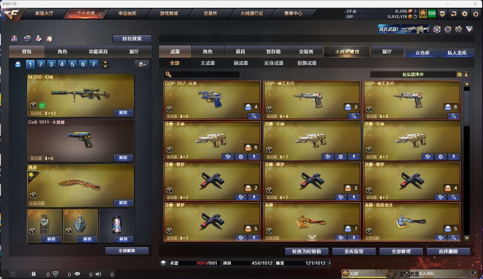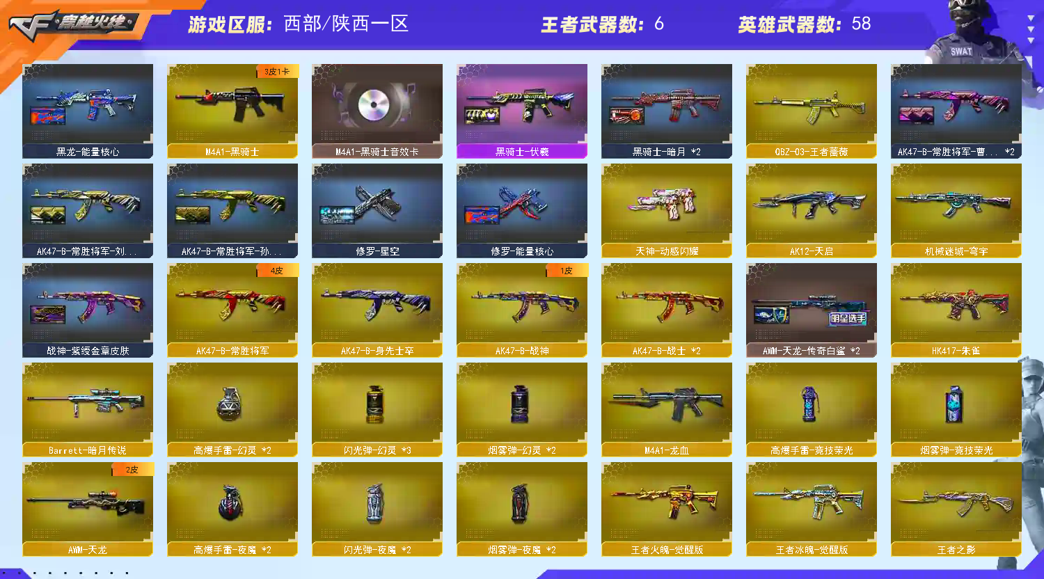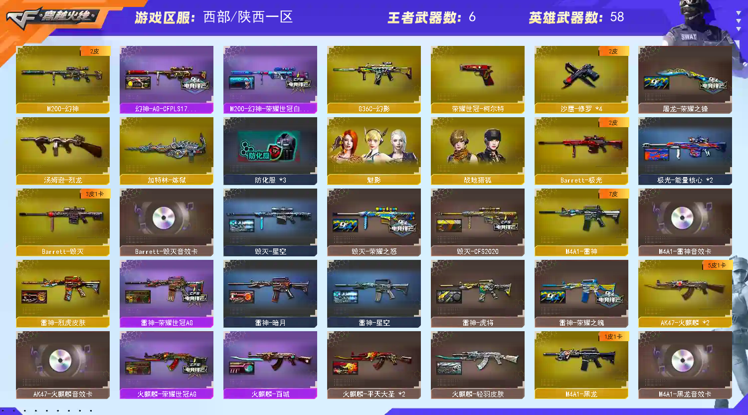 【m200幻神+电流骇客皮肤+usp神工天巧*2】【王者星霆】【传说夜影】【白虎之魄】【qbz03金色蔷薇】【6盘龙+5烈龙】【极光+极光音效卡】【王者之霆 王者之势】【火麒麟 黑龙 黑骑士 千变 无影神兵利器 超新星热带奇洋 天龙 极光 】——【热门武器/小人呛】【炼狱迷你小钢 cop白鲨 金钢伞 猫猫手套 】——【usp神工天巧*2 cop云龙*2 天神*3 修罗*4】——【屠龙 云龙扇 麒麟刺 龙啸 龙啸热带奇洋 唐刀神工天巧】——【热门武器/小人呛】【神工天巧投掷武器套装*7+云龙投掷武器套装*7】——【角色】【4防(晴雅 华 )】【樱 零】;荣耀世冠-柯尔特,G36C-幻影,M200-幻神,