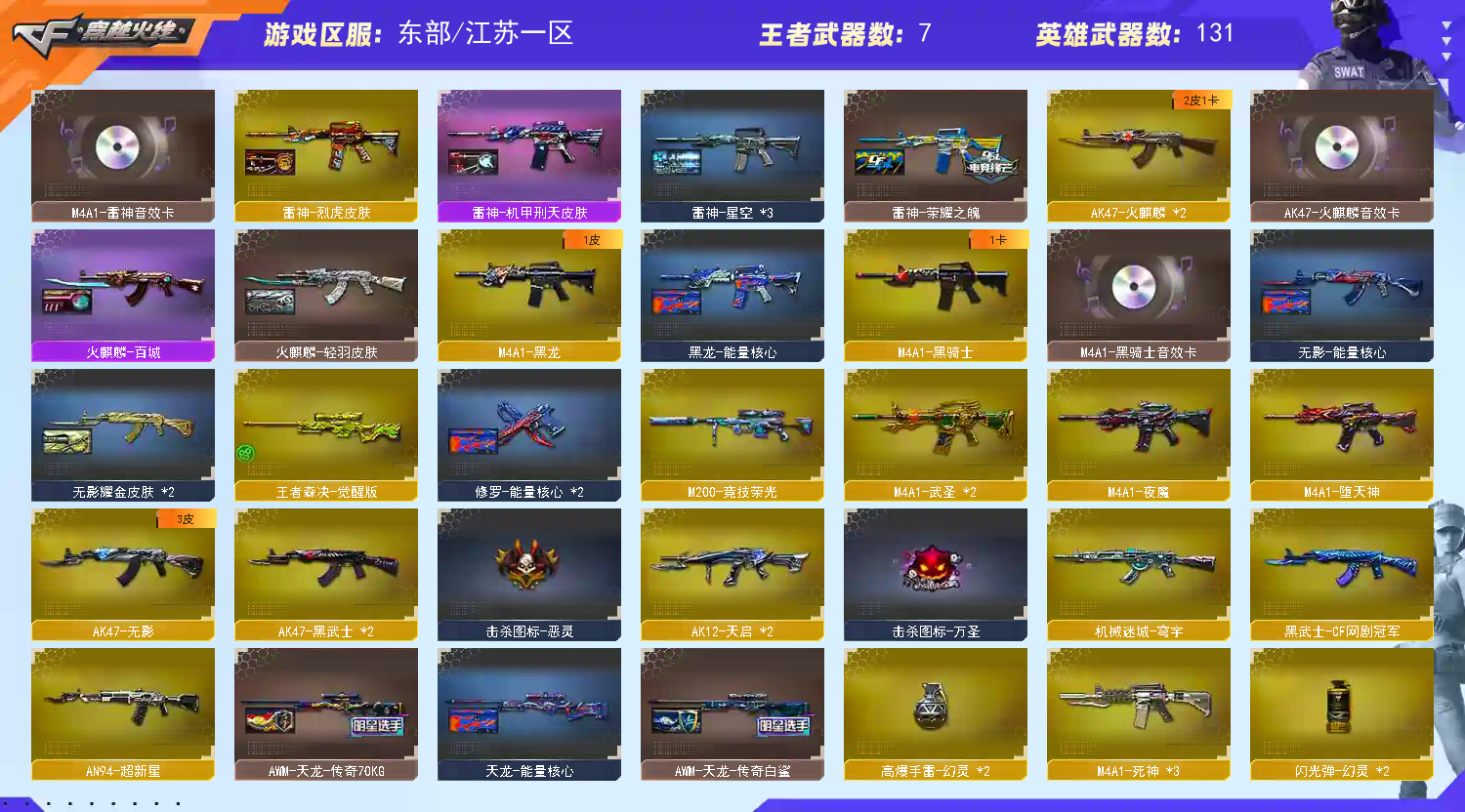 【竞技荣光套+四防云悠悠+usp雷暴】【ScarLight-白虎】【QBZ03-金色蔷薇】【生化 2盘龙 5炼狱 6烈龙】【裁决】【毁灭+音效卡】【极光】【火麒麟+音效卡】【黑龙】【雷神+音效卡+烈虎+雷神-荣耀之魄】【黑骑士+音效卡+白马银枪】【王者之翼 王者之戮 王者之魄 王者之幻 王者冰魄 王者森决】【无影 死神 黑武士 天启 超新星】【20手枪 修罗*3 天神*6 usp雷暴 cop堕天神*3】【18近战 屠龙*2 龙啸 擎天*5 麒麟刺*4 幻灵之锋】【手雷 堕天神*4 夜魔雷*4 幻灵雷*2 竞技荣光】【四防 凌霄 王者葵惊若翩鸿】;USP-雷暴,电竞教官-云悠悠,RPK-盘龙,QBZ03-金色蔷薇,Scar Light-白虎,
