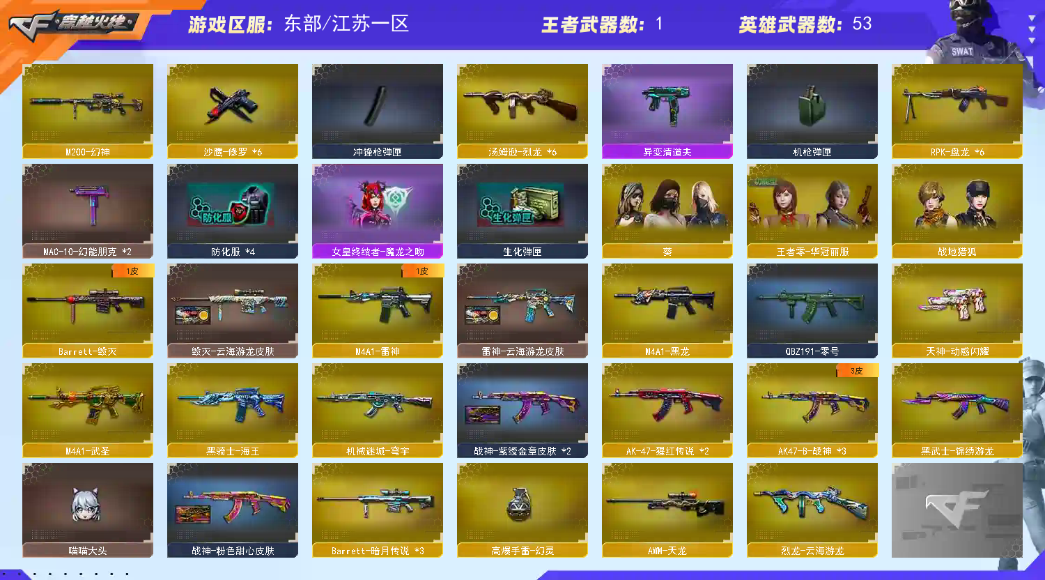 首页 > 租号大厅 > 穿越火线 > 电信区/江苏一区 > 生化爆破双t0✅可打字✅m200幻神✅6烈龙+异变清道夫+6盘炼狱套+蛇隐宗✅7手枪7刀✅qbz古蛇