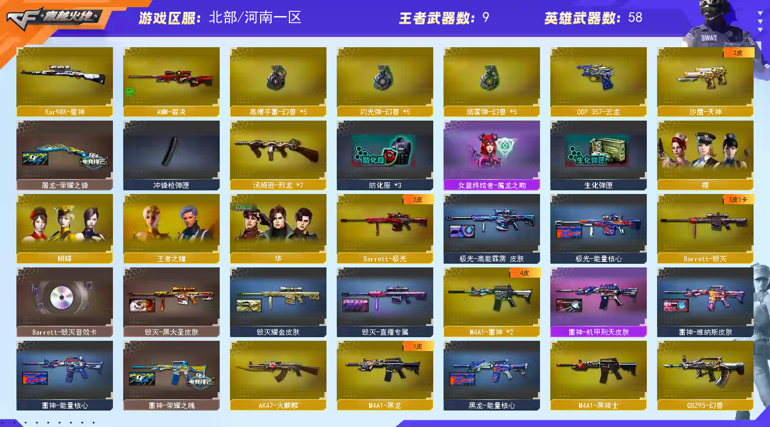 北部战区:河南、河北、山东、山西、北京及东北三省的游戏账号。 编号W428号|68V|河南一区|昵称:8块钱的快餐(VIP6) 本号装备更新于:2025年8月5日 【皮肤】:雷神-荣耀之魄、毁灭耀金x2、天龙秘银(皮肤)x2、火麒麟-CFSTAR、修罗-CFSTARx3、黑龙-能量核心、雷神-能量核心、天龙-能量核心x2、天神-暗月x2、天启-暗月、黑龙-暗月、毁灭-黑大圣皮肤、 【角色】:樱、蝴蝶、华、猎狐者、飞虎队、幻影、雷霆-α、雷霆-β、复仇者、堕天使、活力灵狐、G.E.M.邓紫棋、深海之兰、王者之瞳、夜玫瑰、锋、陈龙野-X、新斯沃特-英特尔、猎狐者-英特尔、娜塔莎、锋、夜玫瑰、救世主、深海之兰、灵狐者、烈锋、王力宏、猎狐者-11周年、新娜塔莎、蜀雪、剑齿虎、暗夜-X、猎狐者-11周年、王力宏、甜心偶像、圣诞潘多拉-X、精英部队、灵狐者-七夕宝贝、樱-战斗天使、初恋灵狐、嘉年华灵狐、猎狐者-X、斯沃特精英、斯沃特、初恋灵狐、樱-战斗天使、铁骑、潘多拉-甜心教官、新奥摩、新赛斯、 【王者】:王者之心-觉醒版x2、王者之怒、王者之光、玫瑰精灵-悦动x2、 【主武】:Kar98K-星神(首发)、征服者-超越3、烈龙x8、死亡之眼、QBZ95-幻兽、毁灭、天龙、裁决、极光、雷神、黑龙、火麒麟、黑骑士、死神、天启、超新星、百城AK47x2、魂·火麒麟-百城、御·雷神-小白龙、雷神-赛博朋克、源·毁灭、源·天启、源·雷神x3、源·火麒麟、火麒麟-暗月x3、源·超新星、源-黑龙、金牛座、天蝎座、白羊座x2、神罚、9A91-赤血龙魂、EVO III-赤血龙魂、AK47-泰坦破坏者III、M4A1-青龙.(活动版)、AK47-青龙、M4A1-战龙、98K-火山、98K-冰雪霸主、黄金MP5-A、黄金9A91、黄金AK-47x2、黄金KAC、AA-12-红色闪电x2、AK47万圣节、御·炼狱-女娲、 【副武】:沙鹰-天神、破空枪刃、沙鹰-幻兽x5、COP-小白龙、新USP-怒火大圣、新USP-战龙x2、MAC-10-涂鸦x2、COP-遗迹、迷你手枪、沙鹰-青龙、Colt 1911-大黄蜂x2、COP357、迷彩沙鹰-70KG、 【近身】:屠龙x2、猫猫手套、擎天、龙啸、麒麟刺x2、女皇利刃-幻兽、轻型军用手斧-镜、唐刀-盛世太平、太极扇、金砖、手斧-n1ce冯永强、军用铁锹-飞龙在天、破天灵蛇、黄金炒锅、金箍棒、影之刃-暗夜风暴、破天斩魔剑、鹰爪-枪王排位、黄金军用手斧、黄金充气大锤、 【投掷】:虎牙手雷(绝版稀有)x2、烟雾弹-幻兽x6、闪光弹-幻兽x5、高爆手雷-幻兽x4、高爆手雷-雷蛇、凤凰之息、闪光弹-CFS2017纪念版x2、手雷-CFS2017纪念版x2、闪光弹-网把、玫瑰手雷x2、 【光效】:王者之心绿色光效x2、龙啸蓝色光效、汤姆逊-烈龙蓝色光效、M4A1-雷神紫橙光效、毁灭蓝色光效x2、黑武士紫色光效、天龙蓝色光效x2、麒麟刺蓝色光效、 【玩偶】:战舰玩偶、电磁巨兽玩偶、 【道具】:超级对讲机(加10%子弹)x2、超级背包、生化弹匣、夺命之镰、防化服x3、迷雾幽灵、灵魂忍者(矮子)x2、变异宝贝、绿色巨人x2、疯狂宝贝x2、7个背包;Kar98K-星神,