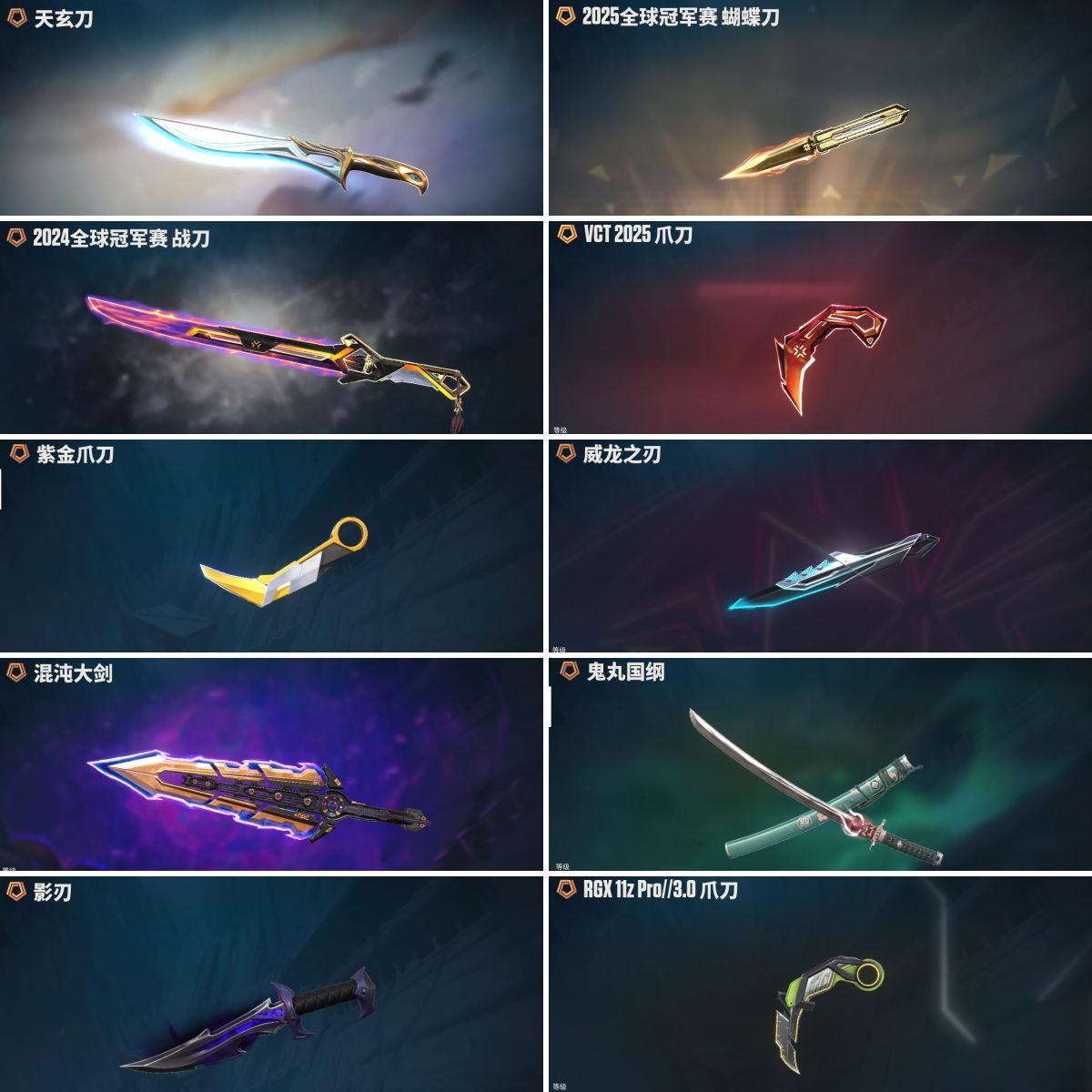 【拥有近战武器】星际猎兵-短剑,阿特拉斯指挥部-甩棍,澄湖滟,日耀风暴-遗器,诡秘蛇影-军刀,VCT-2025-爪刀,神圣领域-战刀,荒土机兵-热能刀,超限闪存-匕首,超能偶像-应援棒,流星兵团-短剑,珍珠棘贝-短剑,钢轨卫士-战锤,沙尘幻旅-匕首,紫金爪刀,RGX-11z-Pro//3.0-爪刀,天玄刀,