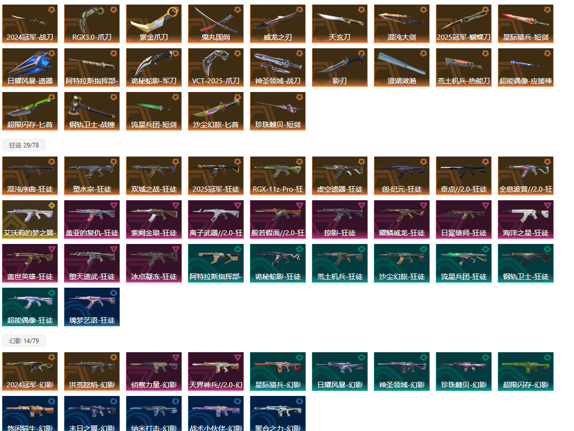 【卡面信息】布鲁诺中校卡面,星宿灿烂猎枭卡面,九命灵猫卡面,VCT2025CN联赛卡面,情人节猎枭卡面,我眼中的世界卡面,分崩离析卡面,我见识过的恐惧卡面,双城之战姐妹卡面,双城之战拥抱卡面,捣蛋鬼出卡面,情人节捷风卡面,RGX11zPro30卡面,超能偶像卡面,势不可挡芮娜卡面,千灵华绽卡面,虹吸式咖啡壶卡面,VCTxLEV卡面,逆向独行卡面,耀鳞威龙卡面,Luie卡面,;紫金爪刀,威龙之刃,VCT 2025 爪刀,天界神兵//2.0 幻影,盖亚的复仇 狂徒,虚空遗器 狂徒,掠影 戍卫,
