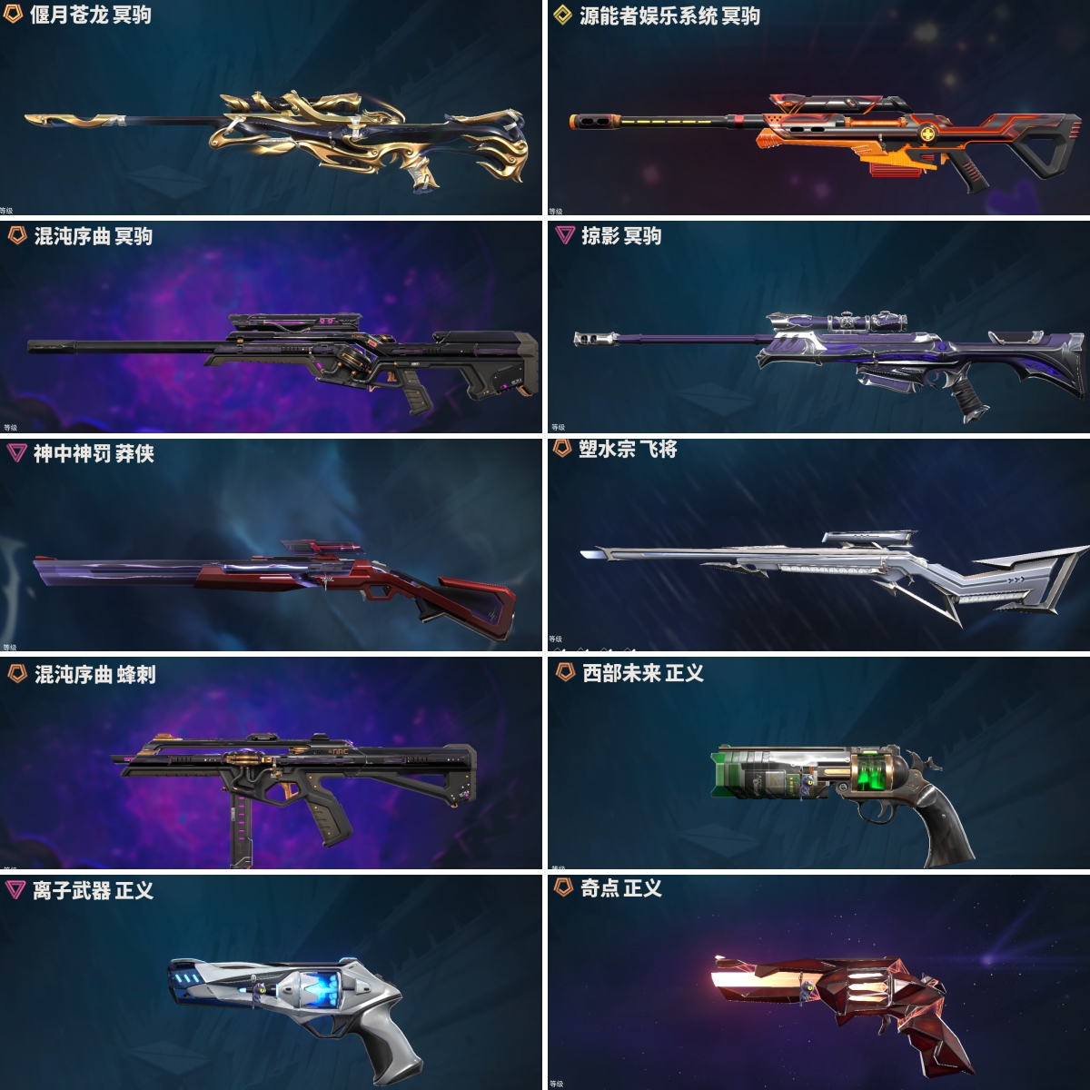 【拥有手枪】VCT25-x-BLG-标配,VCT-x-LEV-标配,西部未来-正义,千灵华绽-正义,奇点-正义,艾沃莉的梦之翼-鬼魅,紫阙金琅-标配,盖亚的复仇-鬼魅,离子武器-正义,星际猎兵-标配,阿特拉斯指挥部-标配,日耀风暴-正义,诡秘蛇影-鬼魅,神圣领域-狂怒,荒土机兵-标配,超限闪存-正义,超能偶像-标配,流星兵团-鬼魅,珍珠棘贝-狂怒,钢轨卫士-短炮,钢轨卫士-狂怒,沙尘幻旅-正义,瑰梦艺语-鬼魅,光环序列-狂怒,太空穿梭-正义,悠闲猫生-短炮,甜蜜战术-鬼魅,幻语魔咒-狂怒,宿怨-鬼魅,折光棱晶-标配,末日之翼-短炮,星云暗涌-鬼魅,月球哨兵-正义,游戏结束-正义,纳米打-正义,逆冲蛮牛-狂怒,浮光跃金-标配,模拟赫兹-鬼魅,聚合之力-狂怒,采蜜小蜂队-鬼魅,纤云弄巧-正义,战术熊与伙伴们-狂怒,纤云弄巧-短炮,战术熊与伙伴们-标配,复古浪潮-正义,深海水族-短炮,光导纤维-标配,光导纤维-鬼魅,萌彩剪影-狂怒,胡桃狂想-鬼魅,