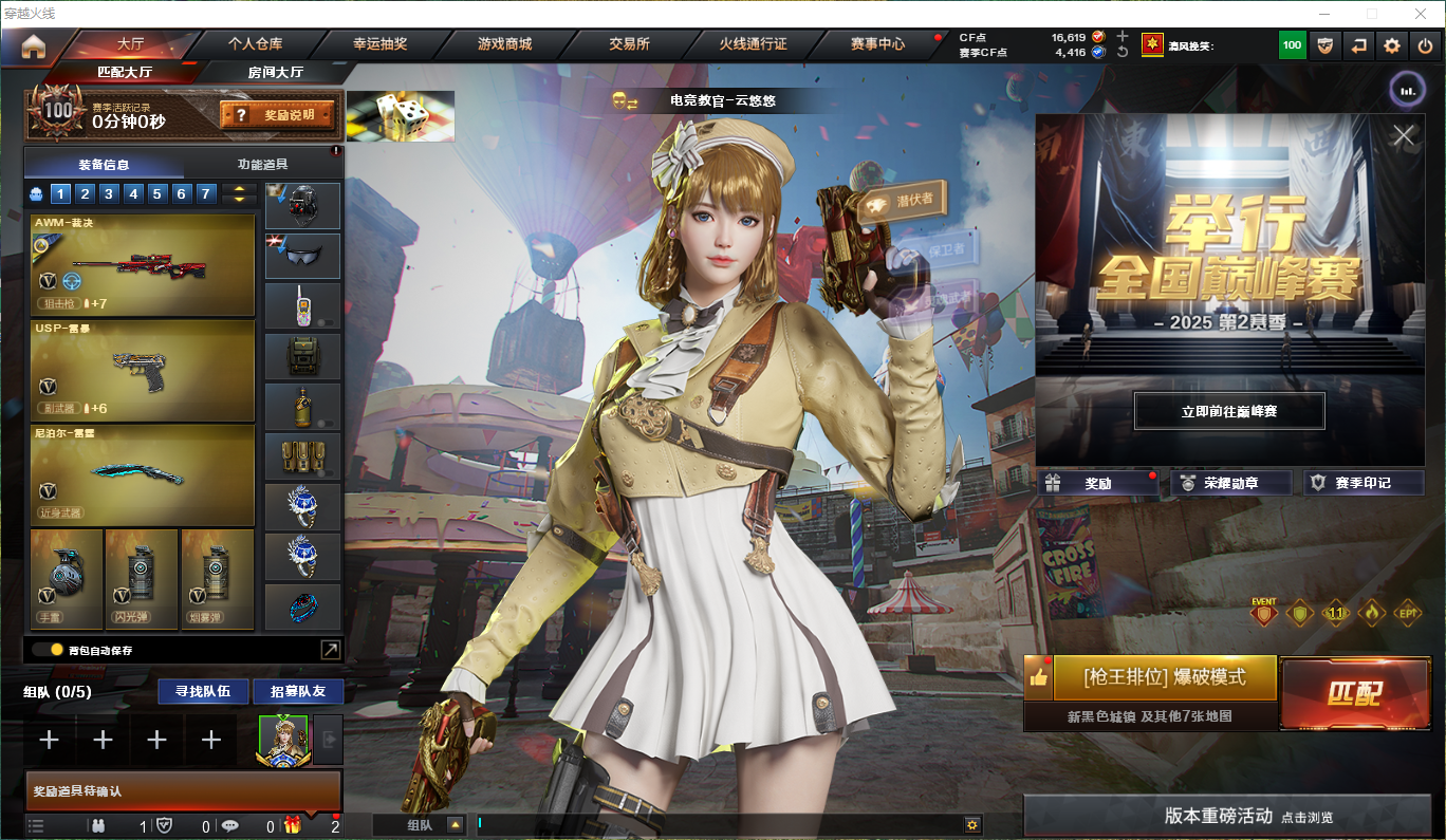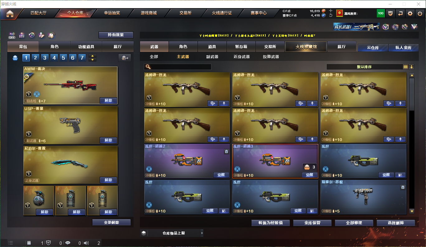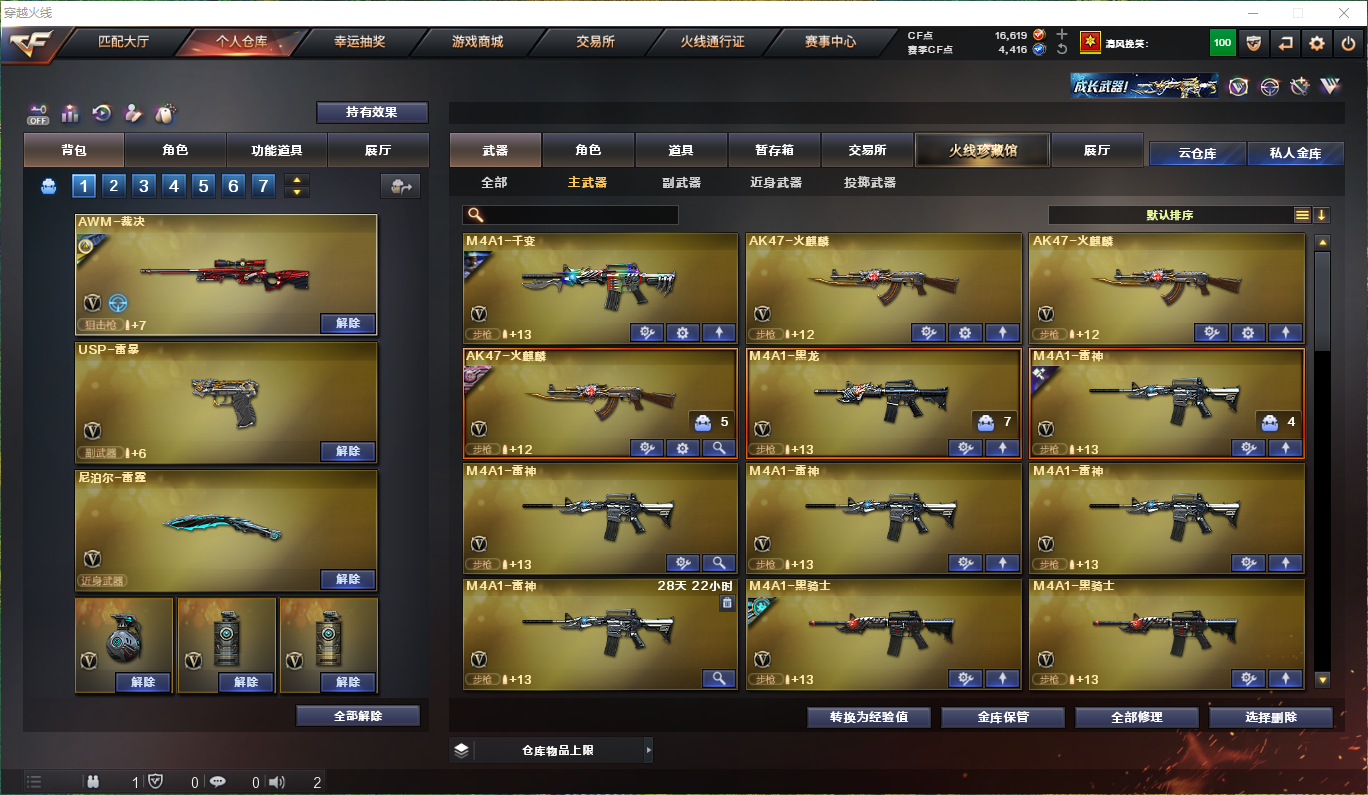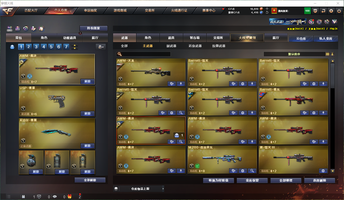 【m200-竞技荣光】【盘龙×6】【炼狱】【烈龙×6】【usp-雷暴】【柯尔特-竞技荣光】【雷神×5】【火麒麟×3】【qbz金色蔷薇×2】【白虎-电玩蓝兔】【屠龙×4】【毁灭×4】【裁决×4带裁决-运输船皮肤带音效卡】狙击呛:【m200-竞技荣光】【毁灭×4】【裁决×4】【极光】【天龙】【barrett-暗月传说】【王者之怒】步呛:【qbz金色蔷薇×2】【白虎-电玩蓝兔】【火麒麟×3】【雷神×5】【黑骑士×2】【千变】【黑龙】【黑武士】【ak47-无影】【m4a1-死神】【ak12-天启】【an94-超新星】【m4a1-武圣】【ak47-机械迷城】【ak47-黑鲨】【无影-神兵利器】【黑武士-锦绣游龙】【机械迷城-穹宇】【m4a1-玫瑰精灵】【m4a1-猎神】【王者之幻】【ak-47-猩红传说×4】【m4a1-赤狱骑士】【m4a1-苍鸣雷神】【王者之势--王者之翼×2】机呛:【盘龙×6】【炼狱】冲锋呛:【烈龙×6】散弹呛:【aa-12-雷霆】手呛:【usp-雷暴】【柯尔特-竞技荣光】【王者之灵】刀具:【屠龙×4】【龙啸×4】【擎天×2】【麒麟刺×2】【弄别人-雷霆】【麒麟刺-堕天神】【龙啸-堕天神】【擎天-竞技荣光】【麒麟刺-百战金芒】【王者之啸】手雷:【雷霆高爆手雷套 堕天神高爆手雷套×2 竞技荣光高爆手雷套×2 雷霆闪光丹手雷套 堕天神闪光丹手雷套×2 竞技荣光闪光丹手雷套×2】音效卡:【火麒麟音效卡 裁决音效卡 雷神音效卡 黑骑士音效卡】角色:【云悠悠 葵 葵-阿尔法武装 奇洋探员 乔伊教练 王者复仇 云海玲珑】皮肤:【黑骑士-白马银呛 裁决-运输船 毁灭-耀金 毁灭-荣耀之怒 火麒麟-ag战队】;USP-雷暴,电竞教官-云悠悠,RPK-盘龙,QBZ03-金色蔷薇,