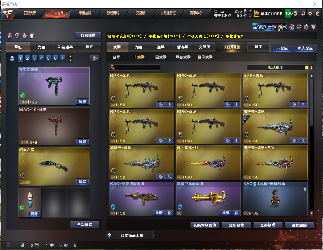 【主武器》白虎/⑥黑骑士/蔷薇qbz/千变/火麒麟/无影/雷神/死神/黑武士/武圣/机械迷城/无影/黑武士/超新星热带奇洋/玫瑰精灵/烈火/2天龙/2毁灭/裁决/朱雀大炮/蔷薇大炮/②炼狱/集束激光超越Max/机甲撕裂者3/激光毁灭者3/末日审判者3/圣炎切割者3/深渊巨龙咆哮3/神圣爆裂者+末日3/试炼破坏者3/死亡之眼庆典CFS2021/A180蓝色骑士/A180蓝色骑士/ 【副武器】⑤修罗/天神/天神动感闪耀/王者之魂觉醒/涂鸦手枪 【近身武器】②幻灵之峰/③屠龙/龙啸/麒麟刺/擎天云海游龙/龙啸热带奇洋/金刚伞/迷你深渊冰龙/迷你波特博士/迷你牛牛/②手斧镜/ 【手雷】迷你生化手雷/高爆幻灵+烟闪/手雷动感闪耀/手雷云海游龙/手雷热带奇洋/高爆古蛇迷踪 【角色】隼/晴雅+四防/新海豹突击队/魅影/瞳/战地猎狐/狐影/乔伊教练/奇洋探员/蛇隐宗/修道士/王者凌霄/云海游龙/荆棘玫瑰/兰海滩派对/灵狐者黄金海岸/零水下丽影/灵狐者职业经理/流浪蔷薇/女战神/职业选手/对讲机/炫彩背包/圣灵戒/魔龙戒 【皮肤】黑龙-冠军之武皮肤/毁灭-SV-CFPLS16冠军+星空皮肤/黑武士-典韦皮肤/火麒麟-轻羽皮肤/ 【音效卡】白虎音效卡/毁灭音效卡/雷神音效卡/极光音效卡/黑骑士音效卡/天神动感闪耀音效卡/ 【道具】紫金大元首/全背包/VIP6/烟雾头/AC/闪光镜/钩子/防化服/变异宝贝/疯狂宝贝/灵魂忍者/迷雾幽灵/绿巨人/步枪/冲锋枪/机枪/生化弹夹/地狱终结者-妲己皮肤/终极猎手-荒漠刀客皮肤/机械猎手-幻灵猎姬皮肤/生化爆破全装;隼,晴雅,RPK-盘龙,QBZ03-金色蔷薇,Scar Light-白虎,