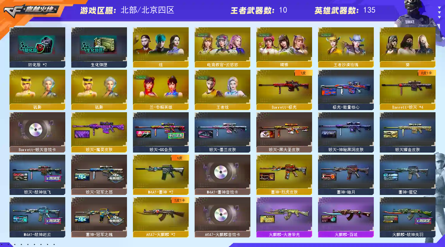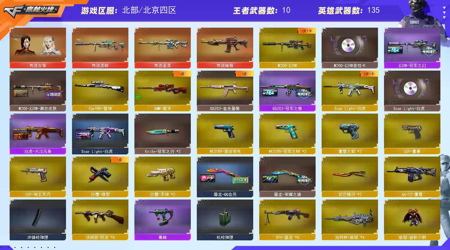 首页 > 租号大厅 > 穿越火线 > 网通区/北京四区 > 传说灵眸+织芒蝶刃+幻神冠军之幻幻音+冠军之特2薇刃+usp2cop2+星神+白虎套+6盘6烈小刚