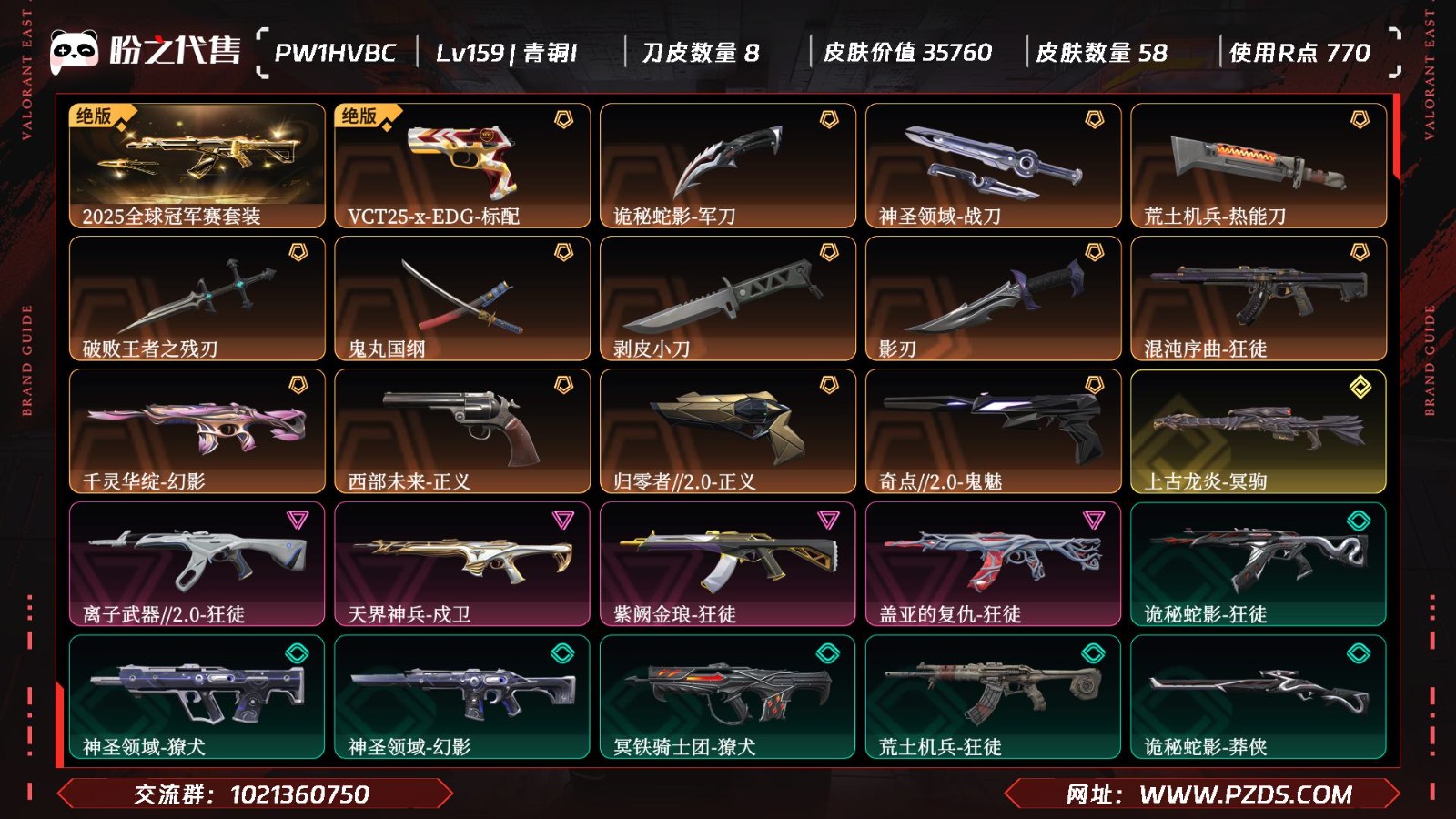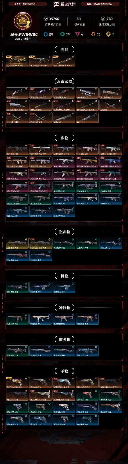 【皮肤资产价值】35760 【使用R点】770 【英雄数量】28 【皮肤数量】58 【卡面数量】93 【喷漆数量】77 【挂件数量】70 【拥有套装】2025全球冠军赛套装(2025全球冠军赛-狂徒,2025全球冠军赛-蝴蝶刀 ) 【拥有近战武器】诡秘蛇影-军刀,神圣领域-战刀,荒土机兵-热能刀,破败王者之残刃,鬼丸国纲,剥皮小刀,影刃, 【拥有步枪】混沌序曲-狂徒,千灵华绽-幻影,离子武器//2.0-狂徒,天界神兵-戍卫,紫阙金琅-狂徒,盖亚的复仇-狂徒,诡秘蛇影-狂徒,神圣领域-獠犬,神圣领域-幻影,冥铁骑士团-獠犬,荒土机兵-狂徒,末日之翼-幻影,折光棱晶-戍卫,月球哨兵-戍卫,,逆冲蛮牛-戍卫,逆冲蛮牛-獠犬, 【拥有狙击枪】上古龙炎-冥驹,诡秘蛇影-莽侠,荒土机兵-冥驹,末日之翼-飞将,星云暗涌-冥驹,月球哨兵-莽侠, 【拥有机枪】神圣领域-战神,末日之翼-奥丁, 【拥有冲锋枪】荒土机兵-骇灵,折光棱晶-蜂刺,星云暗涌-蜂刺,星云暗涌-骇灵, 【拥有霰弹枪】诡秘蛇影-判官,月球哨兵-雄鹿,逆冲蛮牛-雄鹿, 【拥有手枪】VCT25-x-EDG-标配,西部未来-正义,归零者//2.0-正义,奇点//2.0-鬼魅,星际猎兵-标配,诡秘蛇影-鬼魅,神圣领域-狂怒,荒土机兵-标配,折光棱晶-标配,末日之翼-短炮,星云暗涌-鬼魅,月球哨兵-正义,,逆冲蛮牛-狂怒,晶态集成-标配, 【稀有挂件】V25第三幕白银挂饰,超能偶像挂饰,第九季黄金挂饰,超兽队大黄鸭挂饰,超兽队穿林闪挂饰,超兽队海员丹挂饰,超兽队黑曜熊挂饰,超兽队烈火兔挂饰,终章猫猫木乃伊挂饰,猫猫木乃伊挂饰, 【卡面信息】分崩离析卡面,双城之战拥抱卡面,;剥皮小刀,盖亚的复仇 狂徒,紫阙金琅 狂徒,天界神兵 戍卫,混沌序曲 狂徒,离子武器//2.0 狂徒,西部未来 正义,