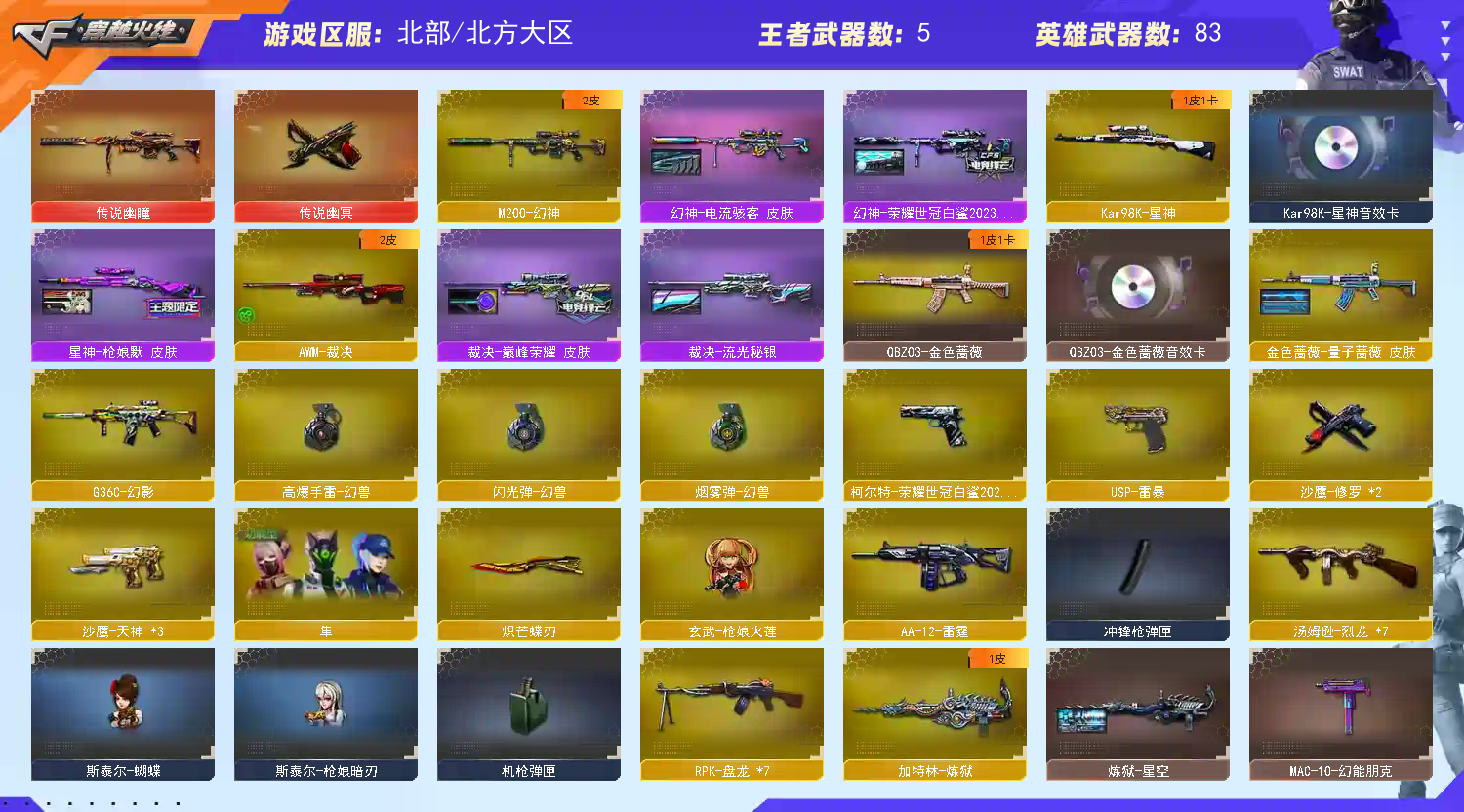 爆破生化全装,看图;USP-雷暴,柯尔特-荣耀世冠白鲨2023,传说幽冥,炽芒蝶刃,隼,电竞教官-云悠悠,RPK-盘龙,