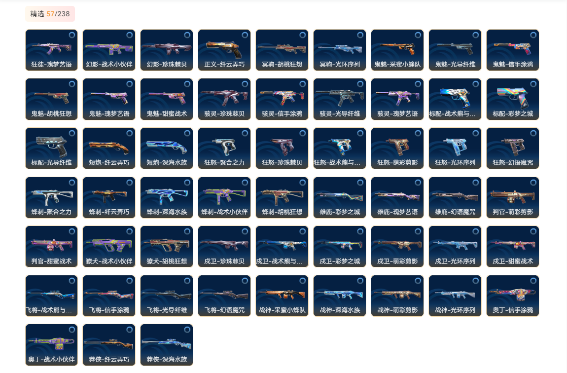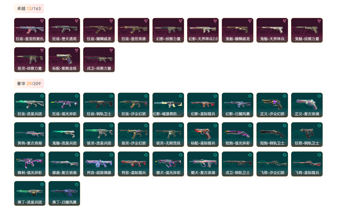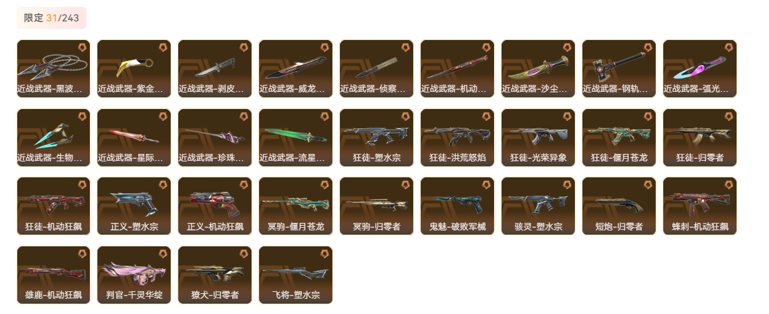 wegame无畏契约★刀皮数量13,枪皮数量116(绝版0限定31终极0卓越12);近战武器-剥皮小刀,近战武器-紫金爪刀,近战武器-威龙之刃,近战武器-机动狂