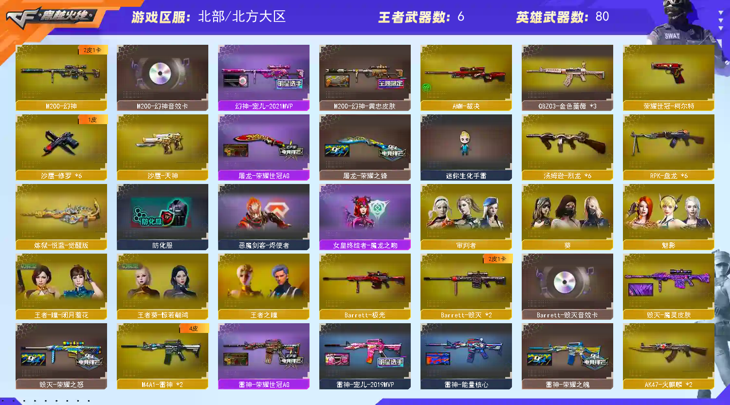 首页 > 租号大厅 > 穿越火线 > 北部/北方大区 > M-200幻神音效卡宠儿黄忠双皮三件套+柯尔特荣耀世冠套王者蔷薇AG冠军皮+生化满6烈6盘死亡之眼