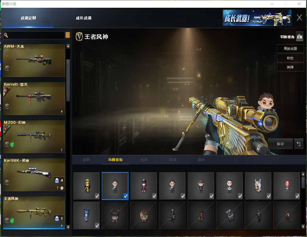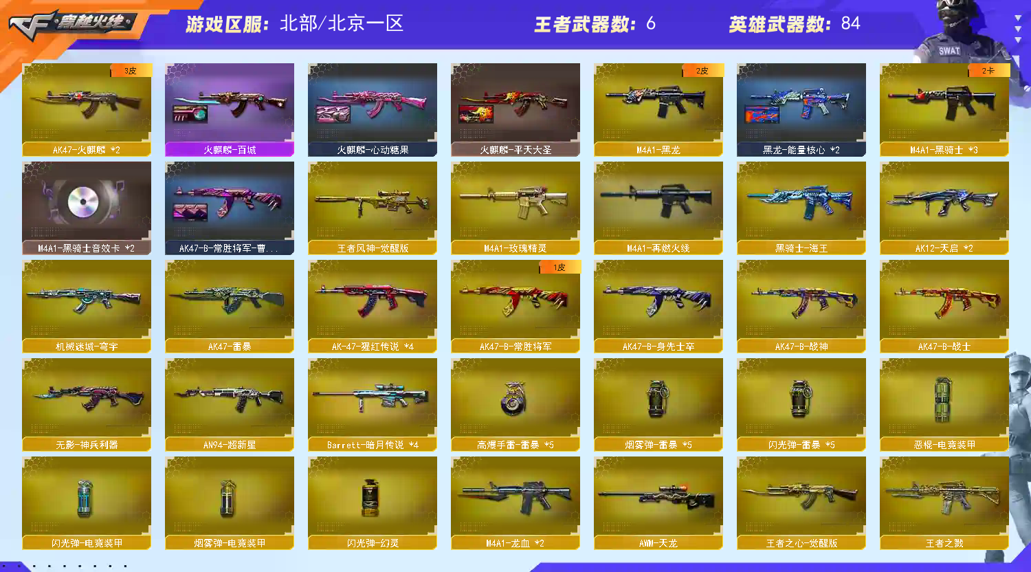 【主武器】传说圣谕/玄豹步枪/M200-幻神/98K-星神/王者风神觉醒/斯太尔蝴蝶/炼狱/⑥烈龙⑥盘龙/AK雷暴/②火麒麟/雷神/黑龙/③黑骑士/②天启/超新星/②龙血/玫瑰精灵/②蔷薇qbz/猩红传说/身先士卒/常胜将军/天龙/毁灭/④暗月传说大炮/苍鸣雷神/雷神精英刀锋/王者之戮/神圣爆裂者末日3/海滩汪汪巴雷特/EVO赤血龙魂/ 【副武器】USP-雷暴/电竞装甲柯尔特/天神/修罗/ 【近身武器】麒麟刺-百战金芒/尼泊尔雷霆/屠龙/王者之击觉醒/擎天/斩神刀雷暴/ 【投掷武器】⑤高爆雷暴+⑤烟闪/③生化手雷 【角色】王者玲珑/王者魅影/审判者/葵/零/樱/灵狐者黄金海岸/职业选手/炫彩背包/对讲机/②戒指/ 【皮肤】幻神-降龙皮肤/雷神-耀金皮肤/火麒麟-AG战队-百城皮肤 【音效卡】星神音效卡/②黑骑士音效卡 【道具】元首/全背包/VIP4/AC/烟雾头/闪光镜/变异宝贝/疯狂宝贝/灵魂忍者/迷雾幽灵/绿巨人/妖姬/女皇终结者-魔龙之吻/步枪/冲锋枪/机枪/狙击枪/手枪/生化弹夹/生化爆破全装;USP-雷暴,RPK-盘龙,QBZ03-金色蔷薇,M200-幻神,Kar98K-星神,传说圣谕,
