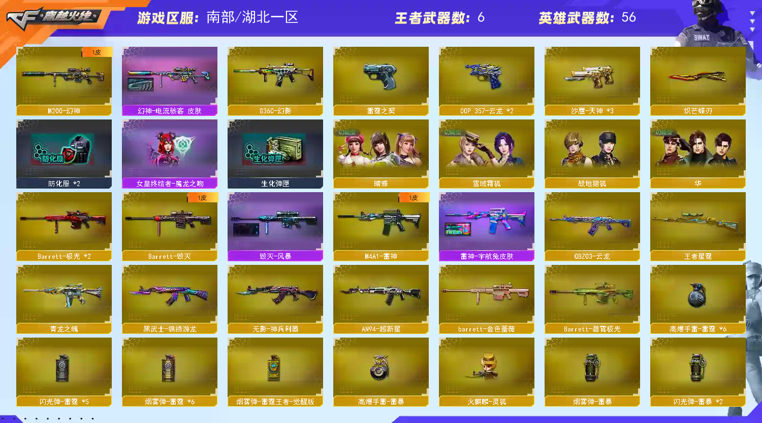 出租不易,请各位老板手下留情。不要开挂放号一马,感谢支持和理解 请不要挂机逃跑有违规辱骂行为 祝各位老板玩的开心,如有违规行为发现则立马拉黑,如遇开挂行为也必追究到底 商户多年号已备案,如开挂被封则必追查到底,根据实名,报警追究,不拿赔偿不罢休,请勿因一时贪心触犯违法行为。祝老板玩的开心愉快🌹喜欢可以收藏关注🌹 幻神电流骇客+王者星霆⚡5雷霆套1雷暴套2云龙套⚡雷霆云龙cop⚡炽芒蝶刃⚡G36C幻影⚡晴雅⚡华⚡王势⚡极光⚡修罗屠龙龙啸擎天等;炽芒蝶刃,晴雅,G36C-幻影,M200-幻神,