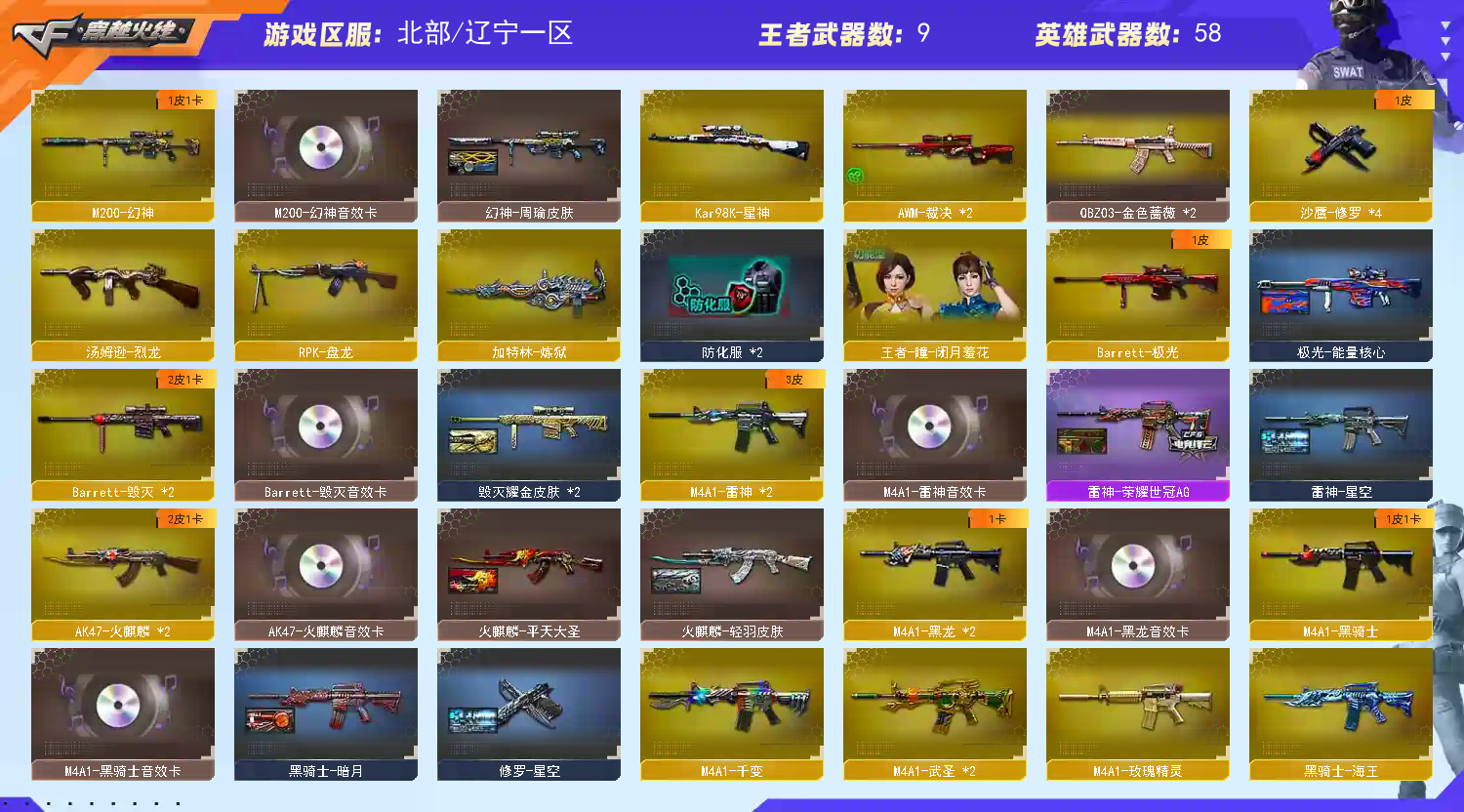 >>>>>>毁号,涉及毁坏虚拟财产罪及计算机安全罪,请文明游戏素质游戏,让我们共建美好租号平台>>>>>> 主武器、副武器、近身武器够用 拥有完美游戏体验。特殊装备有:M4A1-玫瑰精灵、麒麟刺、M200-幻神、加特林-炼狱、HK417-朱雀、AK47-火麒麟、黑骑士-海王、王者之戮、王者之啸、王者之翼、王者之势-觉醒版、闪光弹-雷霆王者、炫金骑士、烟雾弹-雷霆王者、炫金武士、王者之武-觉醒版、炫金火麒麟、炫金黑龙、王者-瞳-闭月羞花、堕天使、M4A1-黑骑士音效卡、等,随意畅选。 注意事项: A.游戏过程中请不要恶意挂机或者不文明发言 B.恶意挂机、顶号等行为将被拉黑无法再次下单 C.进入游戏后中途请勿退出登陆,否则无法再次上号 D.部分账号由于异地登录可能会出现密码错误提示,通常再尝试5-6次后可上号 |||||||||喜欢本账号请点 ☆收藏☆ 方便下次租用,谢谢光临惠顾|||||||||;RPK-盘龙,QBZ03-金色蔷薇,M200-幻神,Kar98K-星神,