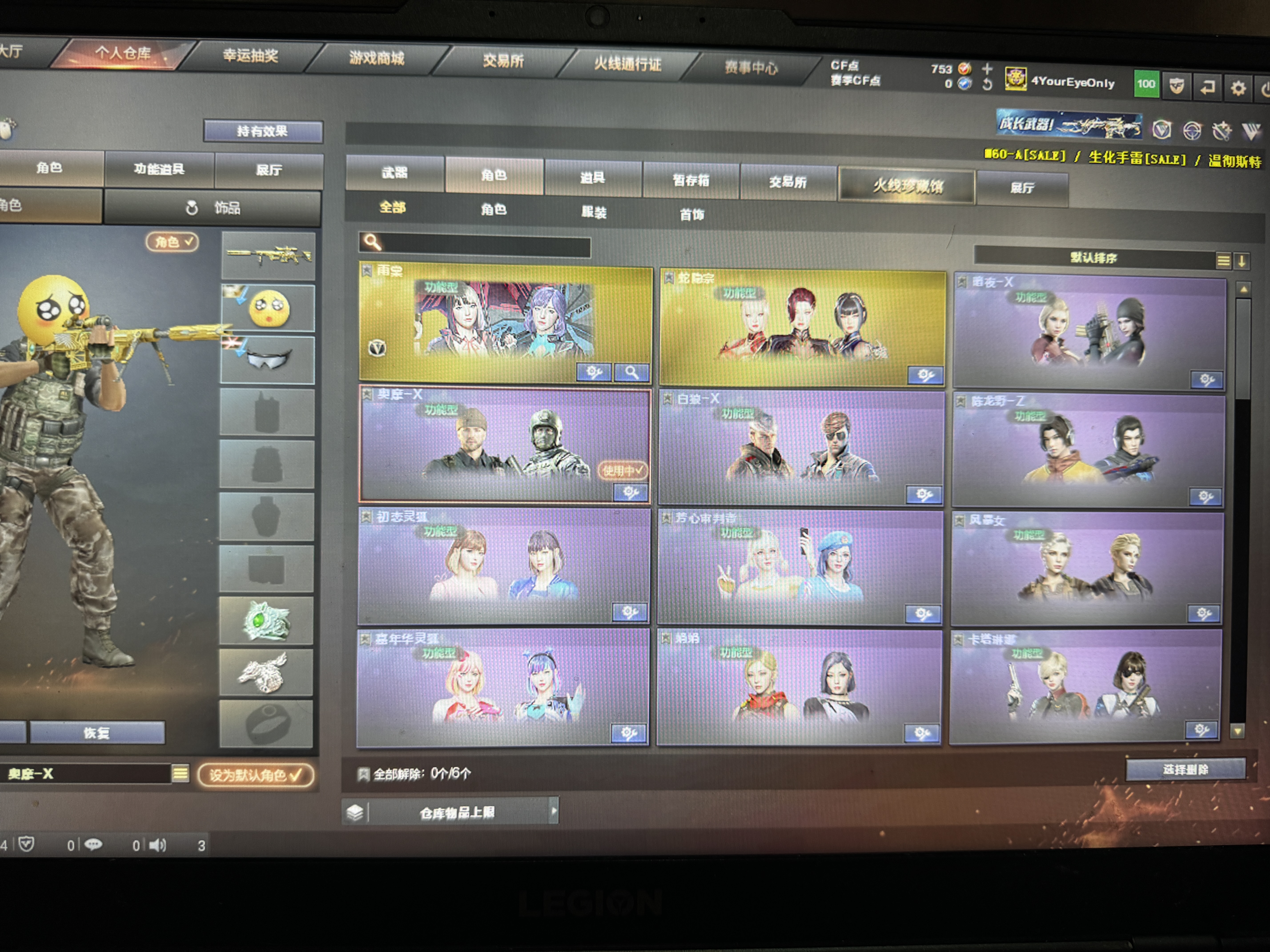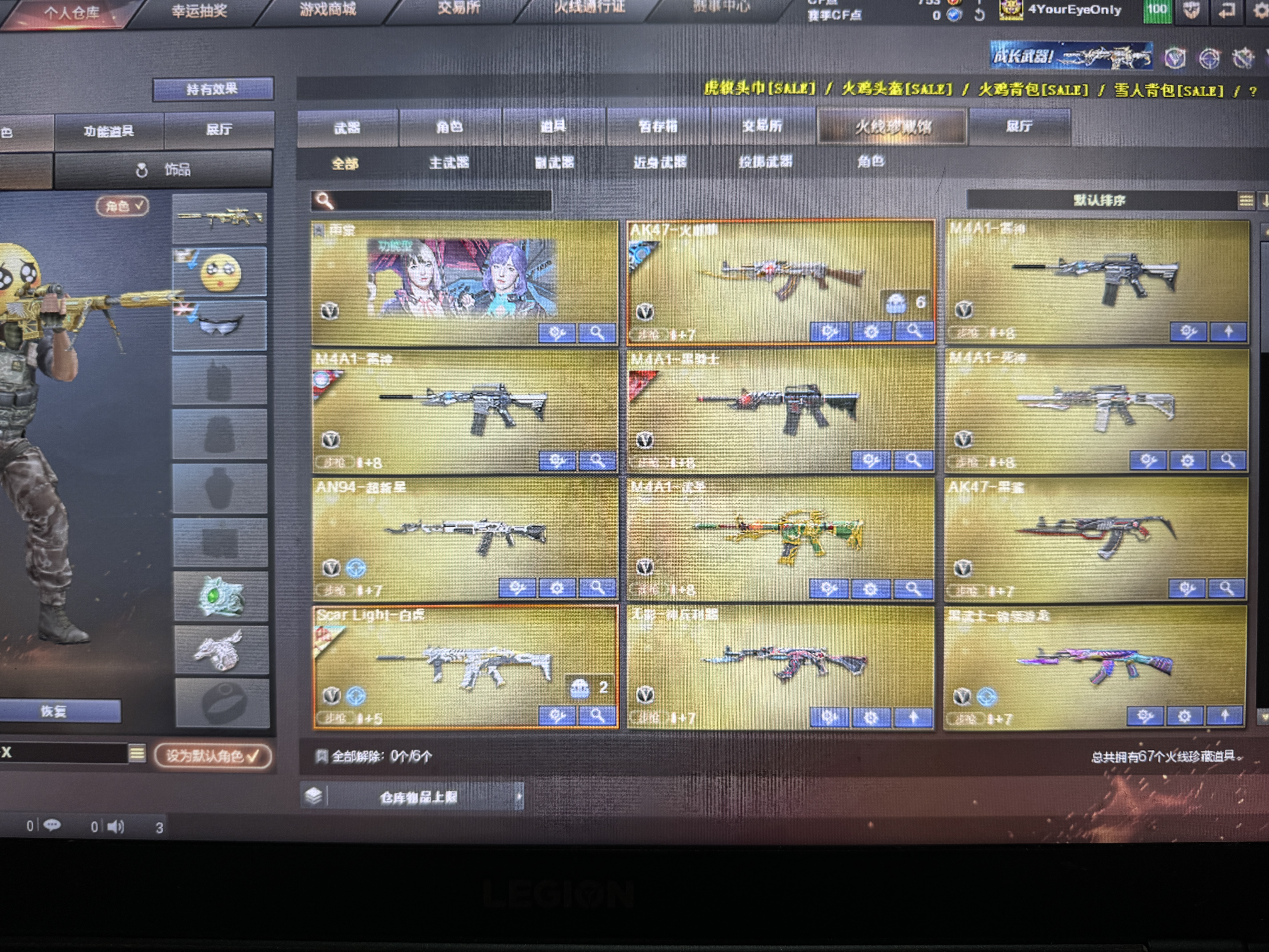 角色】雨棠、暗夜-X、初恋灵狐 【主武】M200-幻神、王者风神M4A1-雷神、M4A1-黑骑士、M4A1-死神、AN94-超新星、M4A1-武圣、AK47-黑鲨、Scar Light-白虎、金色蔷薇、王者冰魄觉醒、AWM-裁决、Barrett-暗月传说、加特林-炼狱、白虎电玩蓝兔、 皮肤:幻神-EP荣耀世冠 QBZ03-拼搏 幻神-AG-CFPLS24冠军 、白虎-白鲨CFPLS23冠军、白虎-AG 、QBZ03-AG-CFPLS19冠军、龙啸-荣耀之巅、裁决-荣耀之巅、雷神-RLGDCFPLS18冠军 裁决-百城联赛天津皮肤 【副武】柯尔特荣耀世冠EP 修罗、天神、Glock18-武圣 【近身】 王者之击 【投掷】EP-烟雾弹 幻灵套、竞技荣光套、雷霆王者套 【道具】7背包、生化弹匣、防弹衣、步枪弹夹、手雷包、C4工具钳 【皮肤】火麒麟-CFSTAR 、白虎AG -CFPL、 QBZ03 -AG CFPL 、雷神 【生化】变异宝贝、究极生化宝箱、夺命之镰、夺命之锋、生化弹匣、防化服 【更新时间】 【东部战区】福建一区、安徽一区、上海一区、浙江一区、浙江二区、江苏一区、江苏二区、教育网区、移动专区、福建电信一区、安徽电信一区、上海电信一区、上海电信二区、浙江电信一区、浙江电信二区、江苏电信一区、江苏电信二区、教育电信网区、移动电信专区(CF相同战区进入相同频道可以一起玩);QBZ03-金色蔷薇,M200-幻神,Scar Light-白虎,