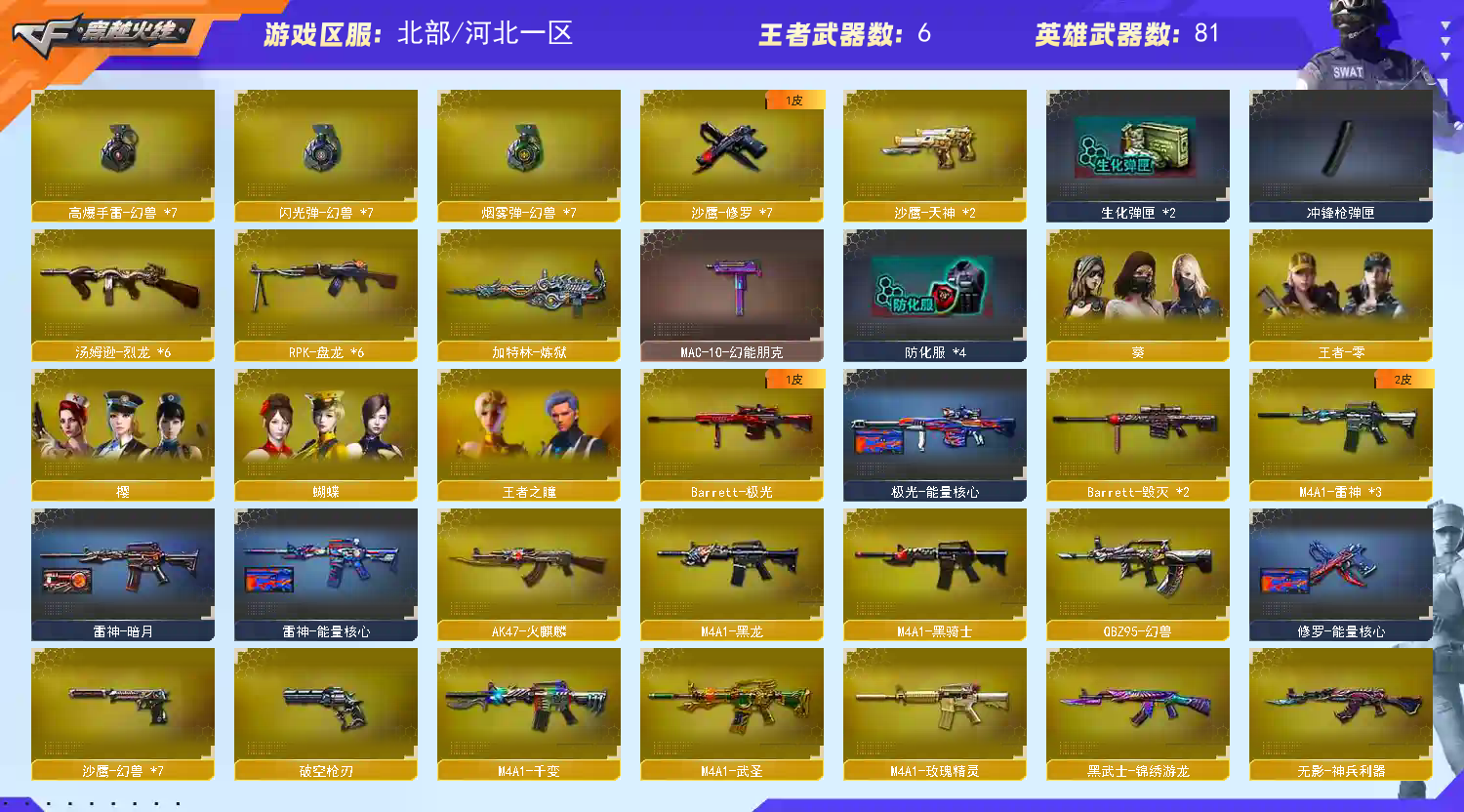 【投掷】:、胜利之光3、银烟1、凤舞云烟7、凤凰之息4、高爆幻兽7、闪光幻兽7、烟雾幻兽7、【道具】:防弹头、防弹衣、手雷包、C4工具钳、手枪弹匣、散弹弹匣、冲锋弹匣、步枪弹匣、机枪弹匣、狙击弹匣、防化服、生化弹匣、不退包、绿色巨人、疯狂宝贝、彩字、彩昵、夺命之镰、幽灵之刃、暴躁猪玩偶、敖丙玩偶、哪吒玩偶、护目镜、烟雾头、炫彩背包、超级背包、超级护目镜、特殊水壶、透明头盔、透明护目镜、闪光护目镜、7个背包;RPK-盘龙,