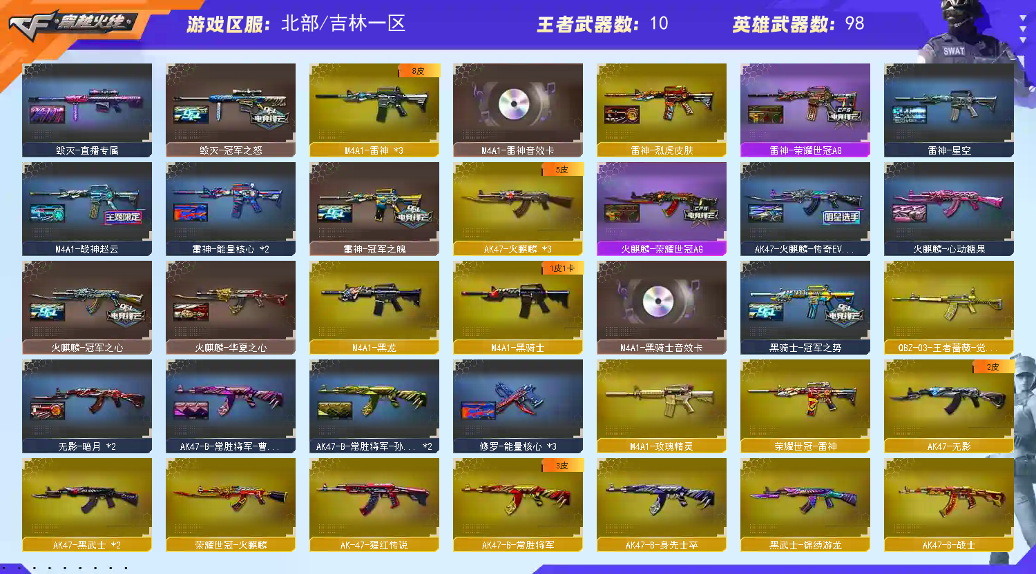 【科技大佬,请你高抬贵手,家里就靠这个号吃饭了,本人上有老,下有小,请你用一丝丝善意想想,给我留一条生路吧,感谢您到来过,谢谢!】 出租不易~~且玩且珍惜~~感谢!!!!!;柯尔特-冠军之特,QBZ03-金色蔷薇,M200-幻神,Scar Light-白虎,Kar98K-星神,