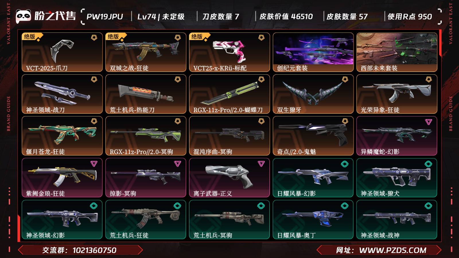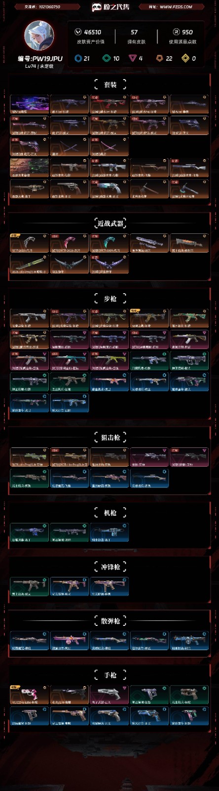 【皮肤资产价值】46510 【使用R点】950 【英雄数量】22 【皮肤数量】57 【卡面数量】76 【喷漆数量】60 【挂件数量】56 【拥有套装】西部未来套装(西部未来-幻影,西部未来-奥丁,西部未来-飞将,西部未来-正义,未来开拓者)创纪元套装(创·纪元-狂徒,创·纪元-莽侠,创·纪元-骇灵,创·纪元-正义,镭切) 【拥有近战武器】VCT-2025-爪刀,神圣领域-战刀,荒土机兵-热能刀,RGX-11z-Pro//2.0-蝴蝶刀,双生獠牙, 【拥有步枪】光荣异象-狂徒,双城之战-狂徒,偃月苍龙-狂徒,异鳞魔蛇-幻影,紫阙金琅-狂徒,日耀风暴-幻影,神圣领域-獠犬,神圣领域-幻影,荒土机兵-狂徒,甜蜜战术-戍卫,月球哨兵-戍卫,逆冲蛮牛-獠犬,逆冲蛮牛-戍卫, 【拥有狙击枪】RGX-11z-Pro//2.0-冥驹,混沌序曲-冥驹,掠影-冥驹,荒土机兵-冥驹,幻语魔咒-飞将,星云暗涌-冥驹,月球哨兵-莽侠, 【拥有机枪】日耀风暴-奥丁,神圣领域-战神, 【拥有冲锋枪】荒土机兵-骇灵,星云暗涌-骇灵,星云暗涌-蜂刺, 【拥有霰弹枪】幻语魔咒-雄鹿,甜蜜战术-判官,月球哨兵-雄鹿,逆冲蛮牛-雄鹿, 【拥有手枪】VCT25-x-KRü-标配,奇点//2.0-鬼魅,离子武器-正义,神圣领域-狂怒,荒土机兵-标配,幻语魔咒-狂怒,星云暗涌-鬼魅,月球哨兵-正义,逆冲蛮牛-狂怒, 【稀有挂件】薰衣草之心挂饰,V25第三幕铂金挂饰,第九季钻石挂饰,终章猫猫木乃伊挂饰,猫猫木乃伊挂饰,迷你浓缩挂饰, 【卡面信息】分神的决斗者卡面,我眼中的世界卡面,VCT2025CN联赛卡面,西部未来卡面,先驱者卡面,分崩离析卡面,双城之战拥抱卡面,;西部未来 奥丁,镭切,VCT 2025 爪刀,异鳞魔蛇 幻影,紫阙金琅 狂徒,光荣异象 狂徒,西部未来 飞将,