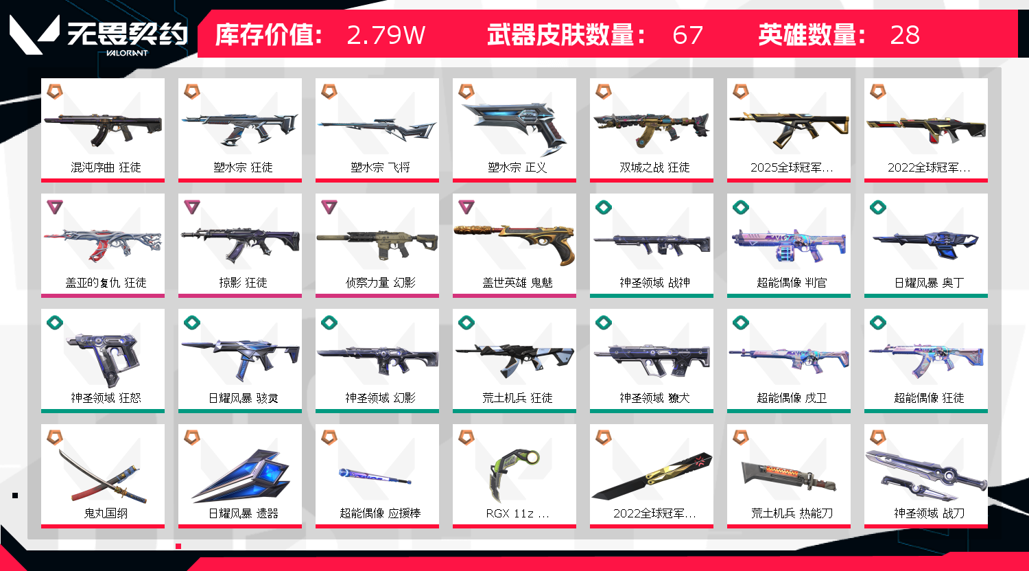 首页 > 租号大厅 > 无畏契约-wegame > wegame/wegame > 塑水宗狂徒/盖亚狂徒/侦察幻影/掠影狂徒/混沌狂徒/塑水宗正义/塑水宗飞将/25冠军狂徒/22冠军套