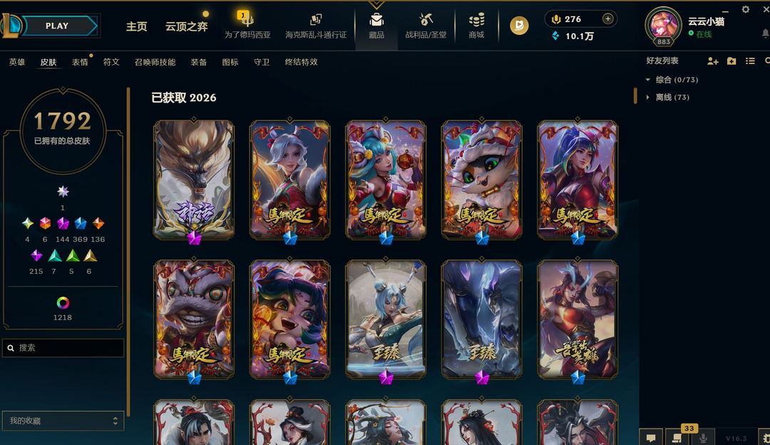 王者归来🌺 1068皮肤至臻全有 海克丝全有 5色龙虾齐 摄魂VN花木兰原计划 电玩情人节