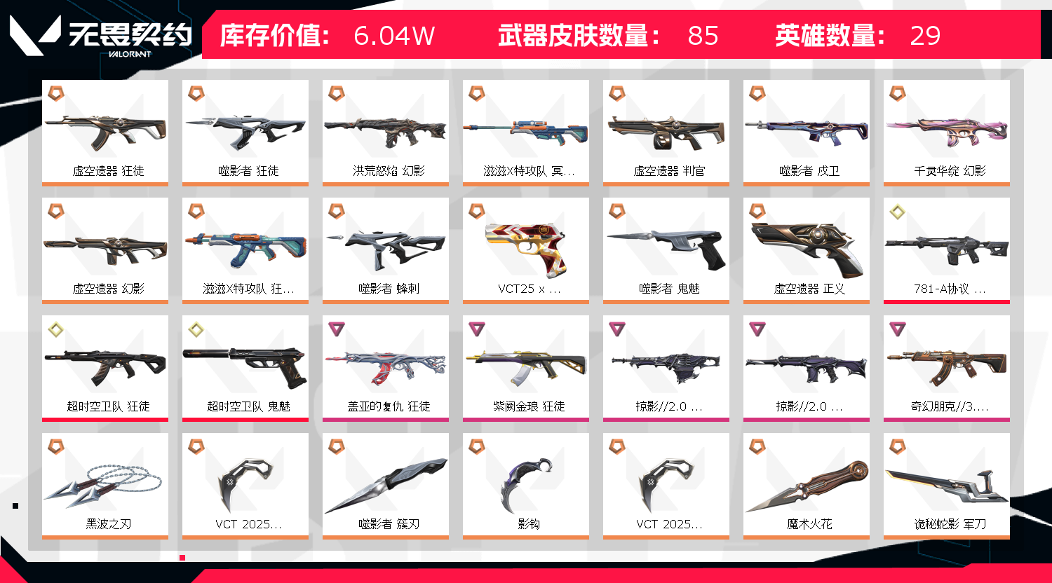 6万库存♥滋滋X特工队套♥奇幻朋克3.0套♥掠影2.0套♥噬影者套♥虚空遗器套♥黑波之刃;黑波之刃,VCT 2025 爪刀,盖亚的复仇 狂徒,虚空遗器 狂徒,噬影者 狂徒,洪荒怒焰 幻影,紫阙金琅 狂徒,