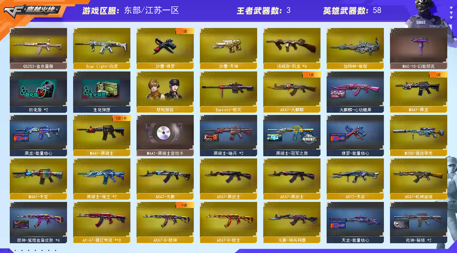 六烈龙生化全装(最新毁灭AG皮肤已获取) 步枪狙击枪爆破全装 各类刀刀战全装 十几种枪械皮肤 (黑骑士音效卡 黑骑士冠军之势皮肤 千变孔明皮肤 黑龙暗月 黑骑士暗月 天启暗月 天龙能量核心 战神紫苑金章皮肤 战神粉色甜心皮肤 黑龙能量核心 ak47老兵传说皮肤 战神流金岁月皮肤 修罗能量核心 死神秘银 修罗cf2018皮肤) 王者之怒王者之魄 物美价廉 还请大家爱惜 十年大礼包勿扰(各位租友好 因为账号异地老是有登录失败 我收到消息时间就会修改密码方便大家登录 望租友大佬见谅╭(╯ε╰)╮);QBZ03-金色蔷薇,Scar Light-白虎,