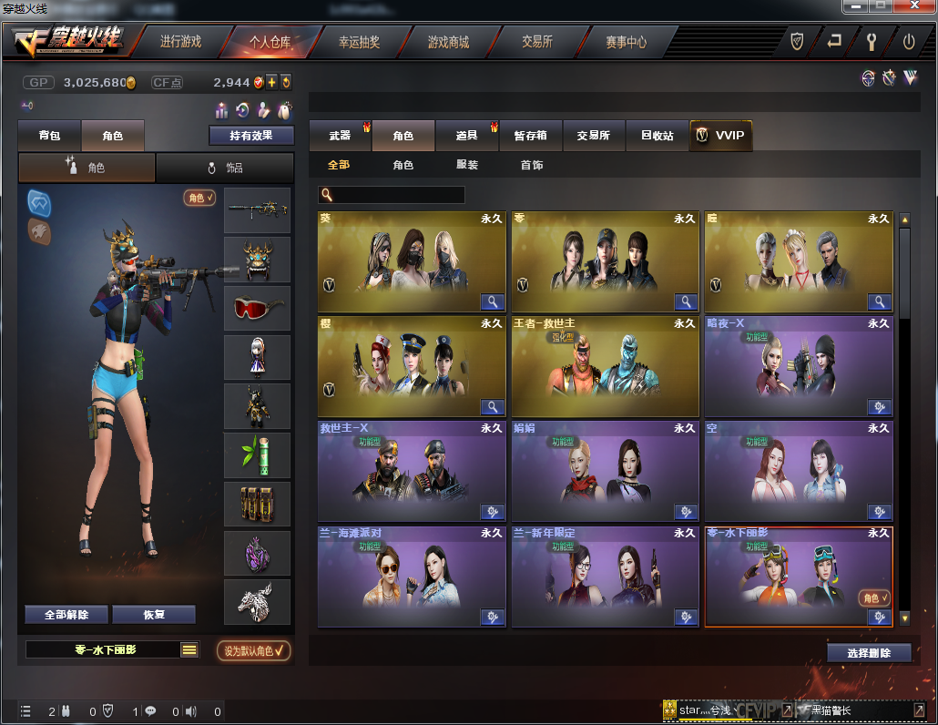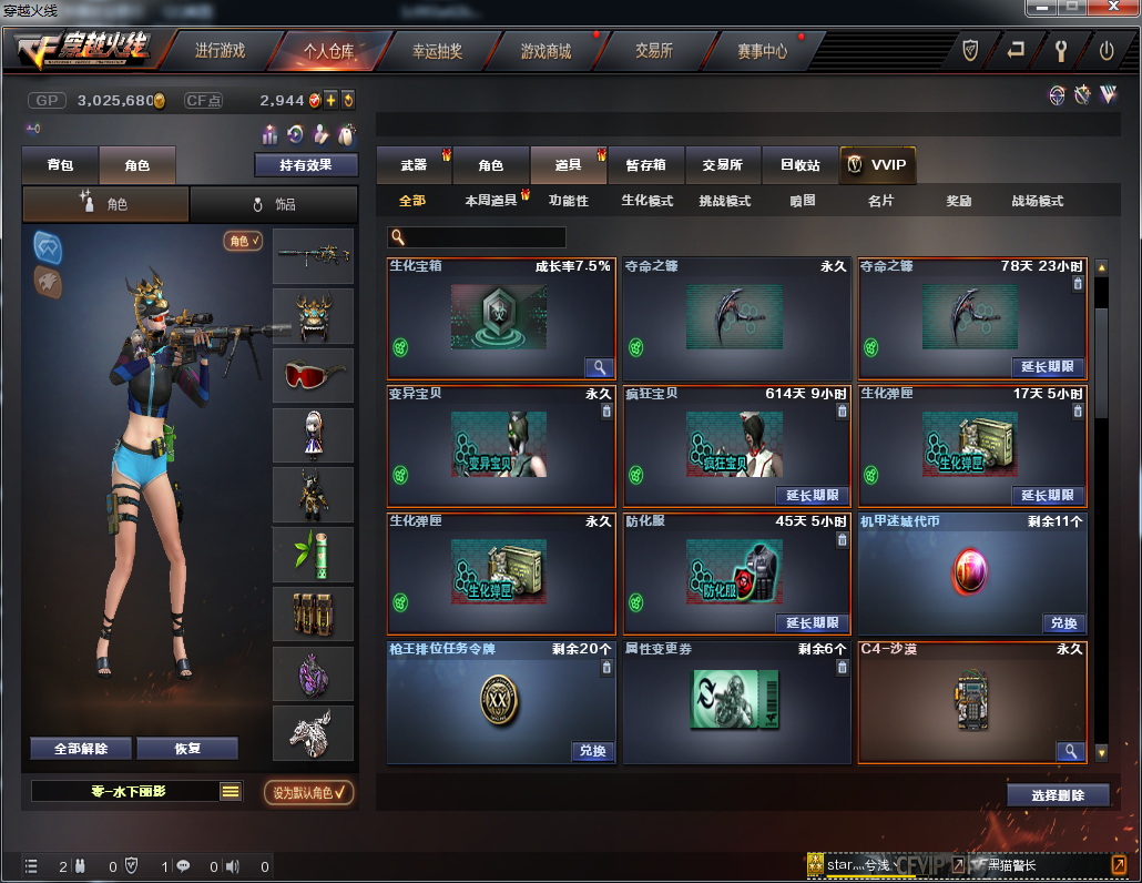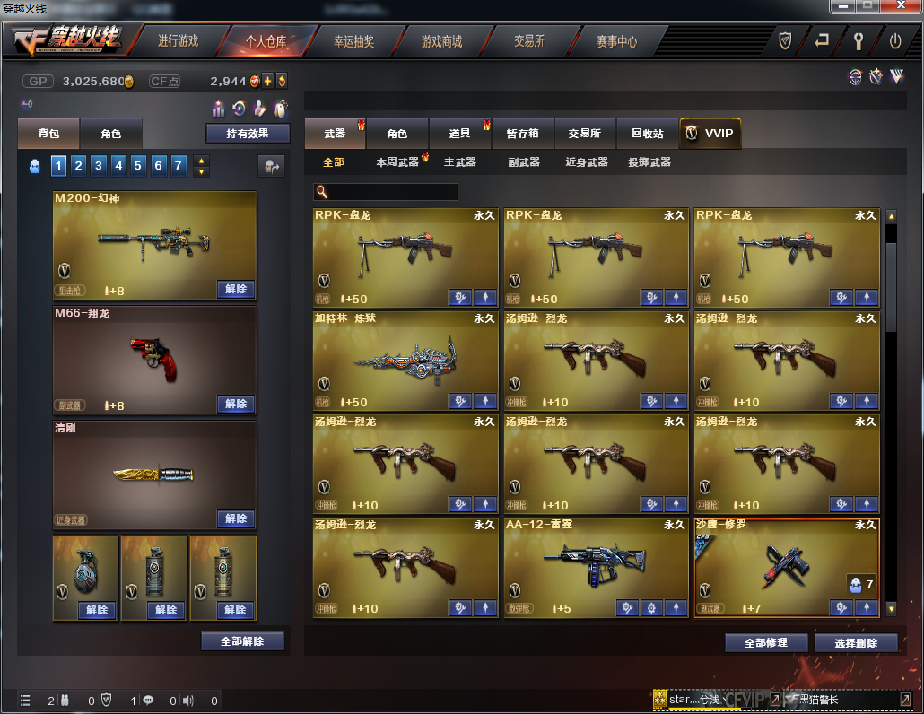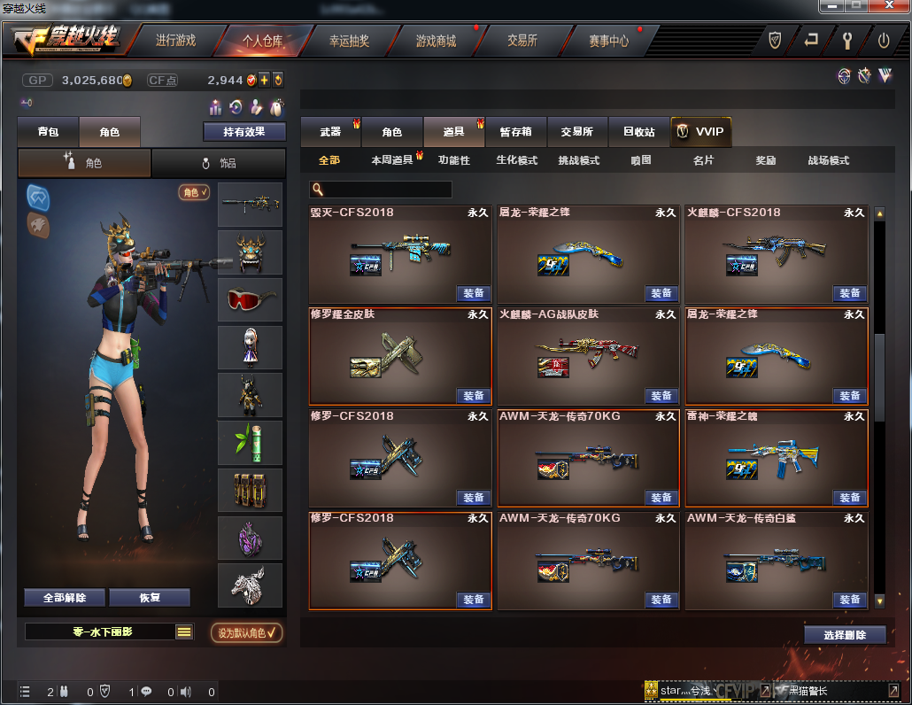 角色:葵、零、瞳、樱、王者救世主、三防角色空、兰海滩派对、兰新年限定、零水下丽影、灵狐者黄金海岸、龙儿、乾隆对X、青霞仙子、蜀雪、雪莉杨、影舞者X、金蛇戒、银蛇戒、圣龙戒、耀金纪念戒、魔龙戒、银蛇戒、毁灭音效卡、雷神音效卡、火麒麟黑骑士音效卡、 主武器:M200幻神、盘龙X5、炼狱、烈龙X6、火麒麟、黑龙、雷神、黑骑士、无影、死神、黑武士、天启、超新星、黑鲨、龙血、玫瑰精灵、QBZ03检核蔷薇、烈火、王者之心、王者之魄、猩红传说、海王、天龙、毁灭、极光、裁决、巴雷特朱雀、巴雷特金色蔷薇、AA12雷霆、雷神精英刀锋、龙雷神、仙界黑骑士、摸金校尉、火麒麟桃园结义、雷神赛博朋克、青龙魂、王者之幻、王者之路、王者之势、王者之影、黑骑士白马银枪、黑骑士海王、黑骑士哪吒闹海、火麒麟平天大圣、雷神烈虎、超新星、源黑龙、源火麒麟、源雷神、源天启、源黑骑士、源机械迷城、源千变、炫金火麒麟、炫金雷神、炫金骑士、炫金武士、毁灭葫芦兄弟、毁灭潜龙、源极光、源天龙、炫金毁灭、死亡之眼、 副武器:沙鹰修罗X2、沙鹰天神X2、修罗摸金校尉、源天神、 近身武器:屠龙X2、龙啸、擎天、麒麟刺、尼泊尔雷霆、王者之击、源擎天、 投扔武器:高爆手雷雷霆、烟雾弹雷霆、闪光弹雷霆、 皮肤:火麒麟CFstear皮肤、雷神虎将皮肤、火麒麟华夏之心、火麒麟雷神皮肤、黑龙361皮肤、黑大圣皮肤、平天大圣皮肤、毁灭CFS2018皮肤、屠龙荣耀之锋、火麒麟CFS2018皮肤、火麒麟AG战队皮肤、屠龙荣耀之锋皮肤、天龙传奇70KG皮肤、雷神荣耀之魄皮肤、天龙传奇白鲨皮肤、 玩偶:8个 爆破全装:烟雾头盔、闪光护目镜、防弹衣、防弹头盔、手雷包、C4工具钳、步枪弹夹、手枪弹夹、狙击枪弹夹、 生化全装:防化服、夺命之镰、生化弹夹、冲锋枪弹夹、生化角色、7背包全开;RPK-盘龙,QBZ03-金色蔷薇,M200-幻神,