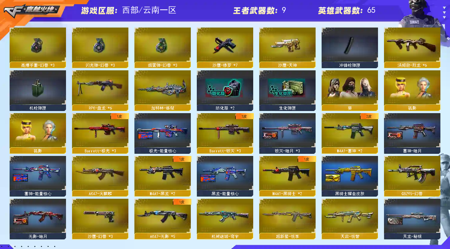 67V-9王者-6烈龙-6盘龙-炼狱-炼狱悦蓝-樱战斗天使+无需换弹+捕食者之眼-王者之心-王者之魄-王者之幻-王者之光-2悦蓝炼狱-王者超新星-王者天启-耀金黑骑士-火麒麟-2黑龙-3雷神-2黑骑士-5无影-2死神-幻兽z95-天龙-3毁灭-3极光-7修罗-天神-3幻兽沙鹰-3屠龙-龙啸-2擎天-2麒麟刺-幻兽女皇利刃-葵-狐影-死亡之眼-斯太尔赤龙-cop旗袍-涂鸦手枪-紫金大元首-全背包-VIP4-冲锋枪-步枪-机枪-生化弹夹-变异宝贝-生化爆破全装;RPK-盘龙,