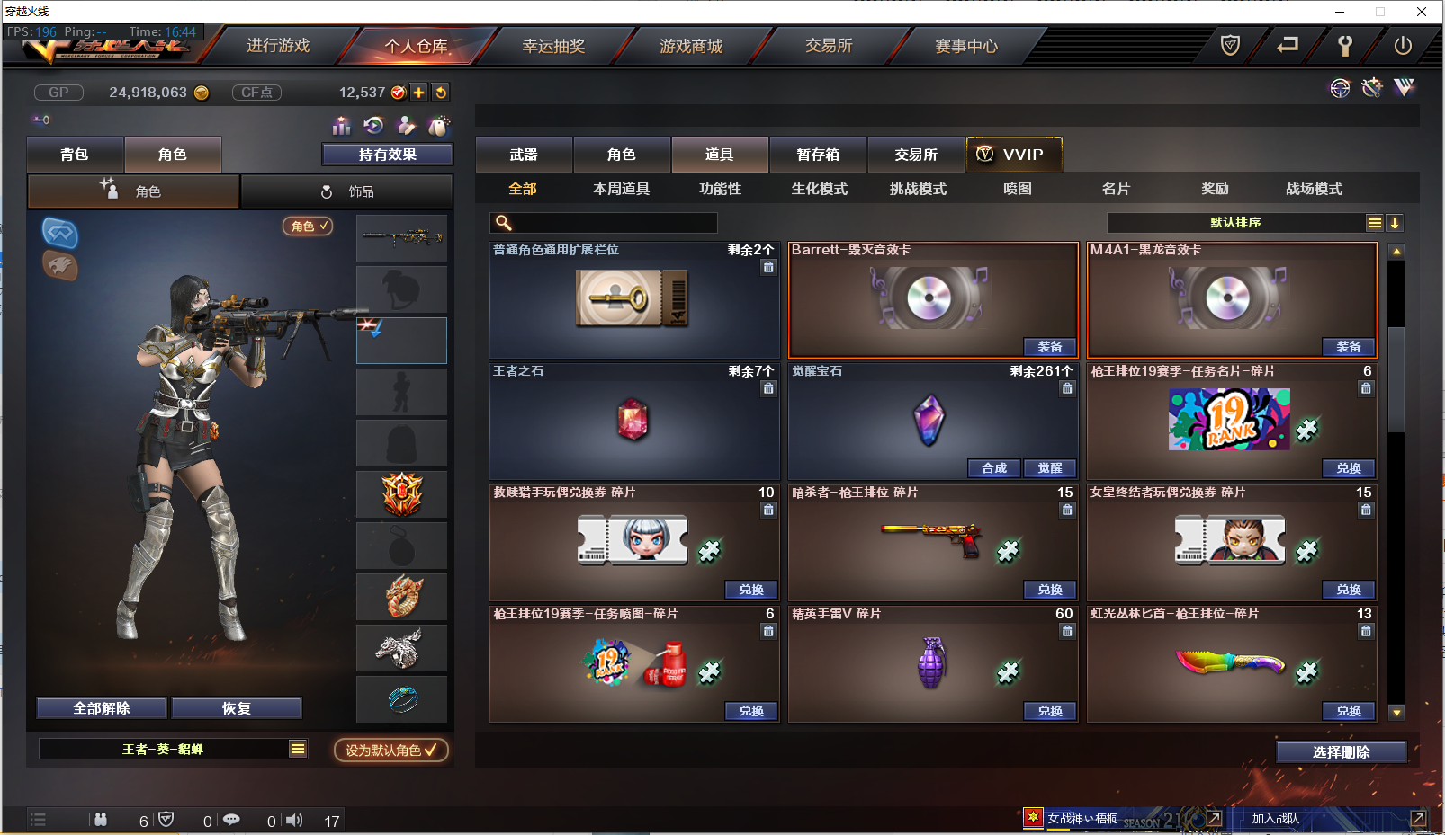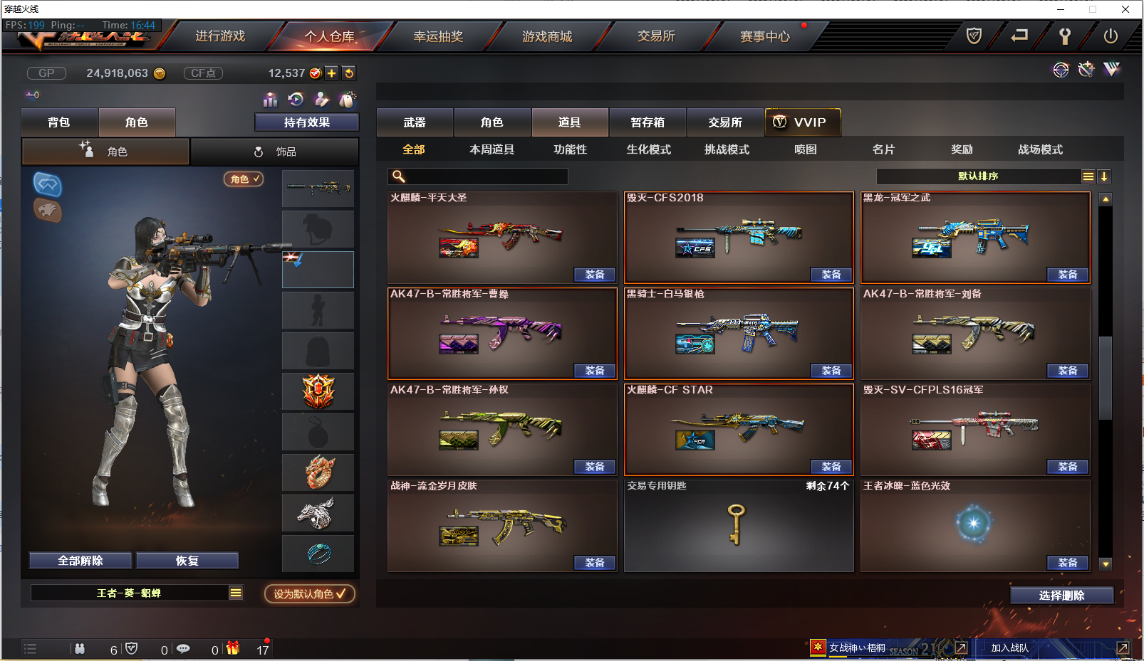 【昵称】BTG263 【角色】王者影豹、王者葵-貂蝉、王者涂鸦、蜀雪、莎莎 【主武】火麒麟、雷神、黑龙、黑骑士、无影、烈火、王者之幻、AK47-猩红传说、战士、海王、葫芦兄弟、身先士卒、常胜将军、毁灭、裁决、M200-幻神、Barrett-金色蔷薇、暗月传说、炼狱、 【副武】沙鹰-天神、cpo*堕天神、 【近身】 屠龙、麒麟刺、-堕天神、龙啸、;龙啸-堕天神、幻灵之锋、王者之啸、王者之击、 【投掷】堕天神手雷套、幻灵手雷套、 【音效】毁灭音效卡 黑龙音效卡 【道具】永久防弹衣永久防弹头盔永久C4工具钳永久手雷包 【皮肤】毁灭cfs2018、黑龙-冠军之武、龙啸-冠军之啸、雷神-星空、AK47-曹操、黑骑士-白马银枪、;M200-幻神,
