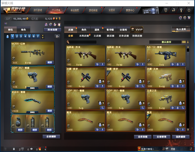 M200幻神|火麒麟AG|雷霆套|王者之心|雷神|黑骑士|炫金天龙|M37葵|2炼狱2烈龙|生化爆破全装号 【编号】 GDA469 【角 色】:CFVIP6、樱、炫、魅影、堕落女神、剑齿虎-x、王者零传说之路、新猎狐者、蜀雪、超级对讲机、8周年戒指、双龙戒指、双蛇戒指、锋芒之环等 【主 武】:M200幻神、火麒麟(AG战队)、黑龙(能量核心)、雷神、黑骑士(暗月)、黑武士、天启、黑鲨、雷霆、猎神、烈火、王者之心、黑骑士海王、天龙(能量核心)、毁灭(暗月)、极光、裁决、Barrett雷霆、暗月传说、炼狱x2、烈龙x2、AA12雷霆、货期领灵狐、玫瑰精灵悦动、王者之影、炫金火麒麟、天龙曼陀罗、炫金天龙等诸多武器 【副 武】:沙鹰修罗x2、沙鹰天神、cop雷霆x2、王者之灵、修罗摸金校尉、cop旗袍、MAC10涂鸦、1911大黄蜂等 【近 身】:屠龙x3(荣耀之锋)、龙啸x3、擎天x2、麒麟刺x2、尼泊尔雷霆、斩神刀雷暴、王者之锋、破天斩魔剑等 【投 掷】:雷霆手雷包x7、雷暴手雷包x3、凤凰之息、音乐手雷、肥皂手雷、雷蛇手雷、太极手雷、巧克力手雷等 【道 具】:2音效卡、小兔姬玩偶、深渊冰龙玩偶、关羽玩偶、审判者玩偶、7个背包、AC(防弹衣+防弹头盔)、C4工具钳、手雷包、挑战弹夹、夺命之镰、变异宝贝、灵魂忍者、生化弹夹、防化服、机枪弹夹、冲锋枪弹夹、散弹枪弹夹、手枪、弹夹、狙击枪弹夹、步枪弹夹、减少停顿包;M200-幻神,