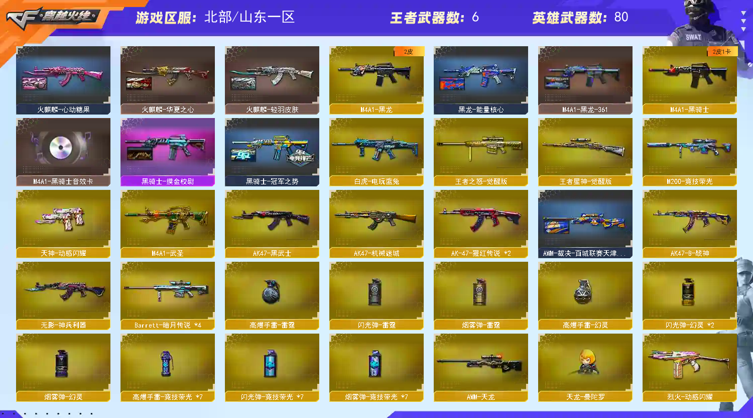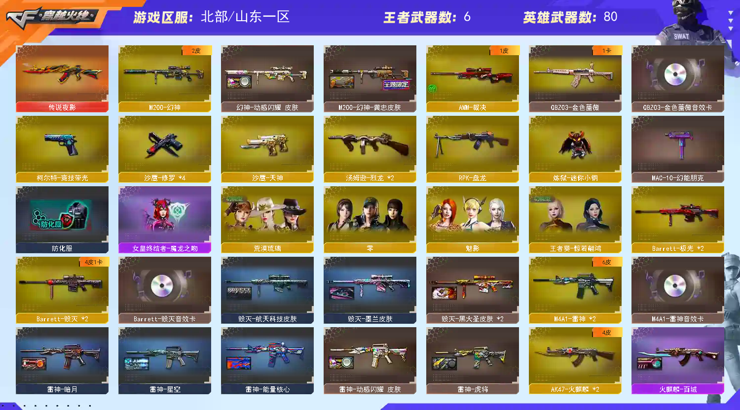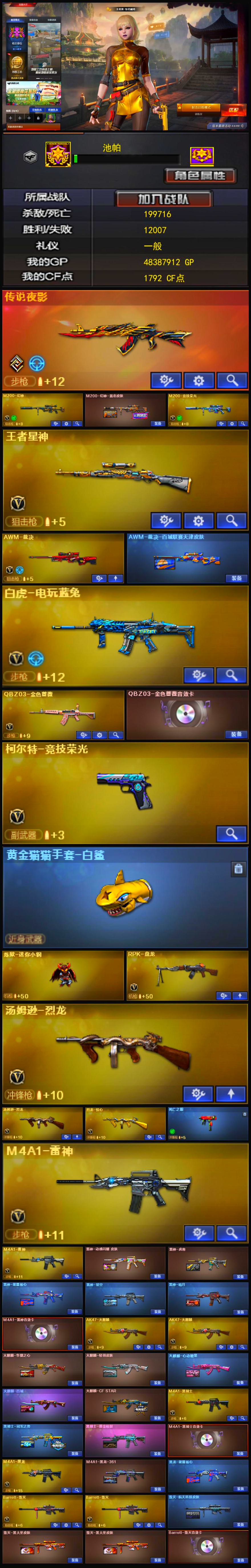 可排位88V/M200-幻神+黄忠+动感闪耀+双光效/传说夜影/竞技荣光套/电玩蓝兔+QBZ蔷薇+王者星神+5音效卡;RPK-盘龙,QBZ03-金色蔷薇,M200-幻神,