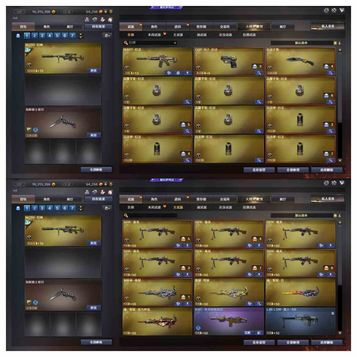 幻神白鲨冠军之幻+幻神音效卡+幻灵/鹰qbz巅峰荣耀+白虎/传说梦魇/幻灵套/生化6盘6烈死亡;Knife-冠军之刃,RPK-盘龙,QBZ03-金色蔷薇,M200-幻神,Scar Light-白虎,