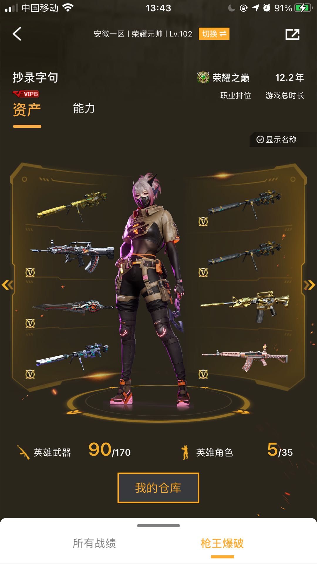 90v爆破全装+可排位,幻兽套装、竞技荣光套、幻神+王者风神(觉醒版);隼,电竞教官-云悠悠,QBZ03-金色蔷薇,M200-幻神,