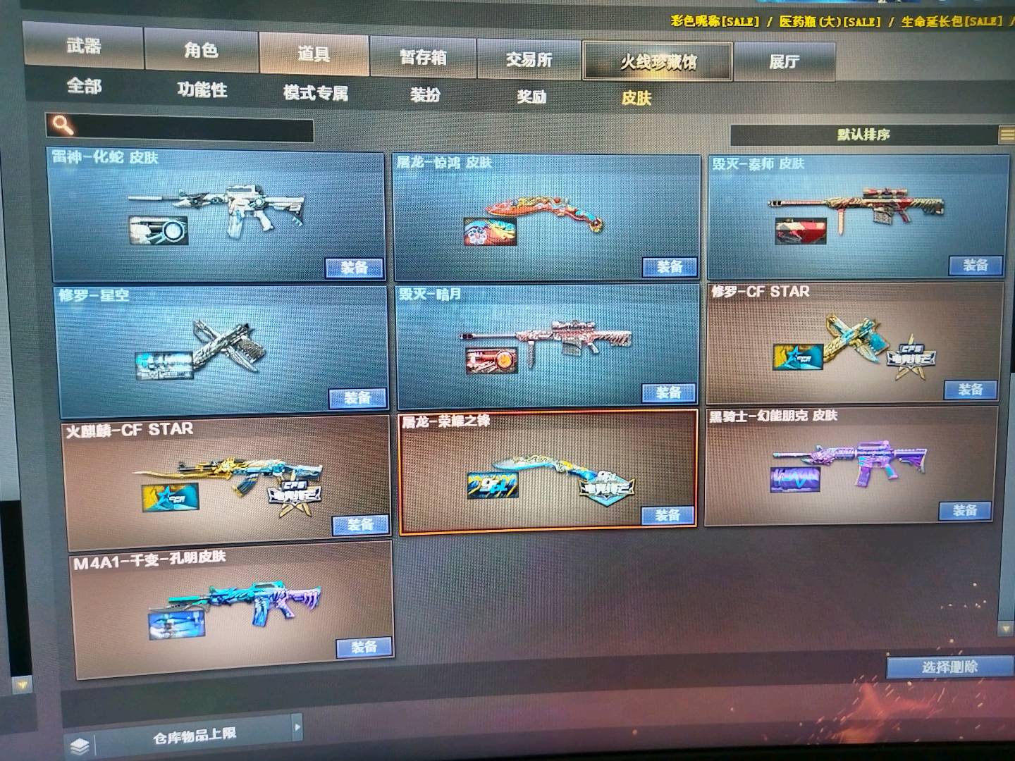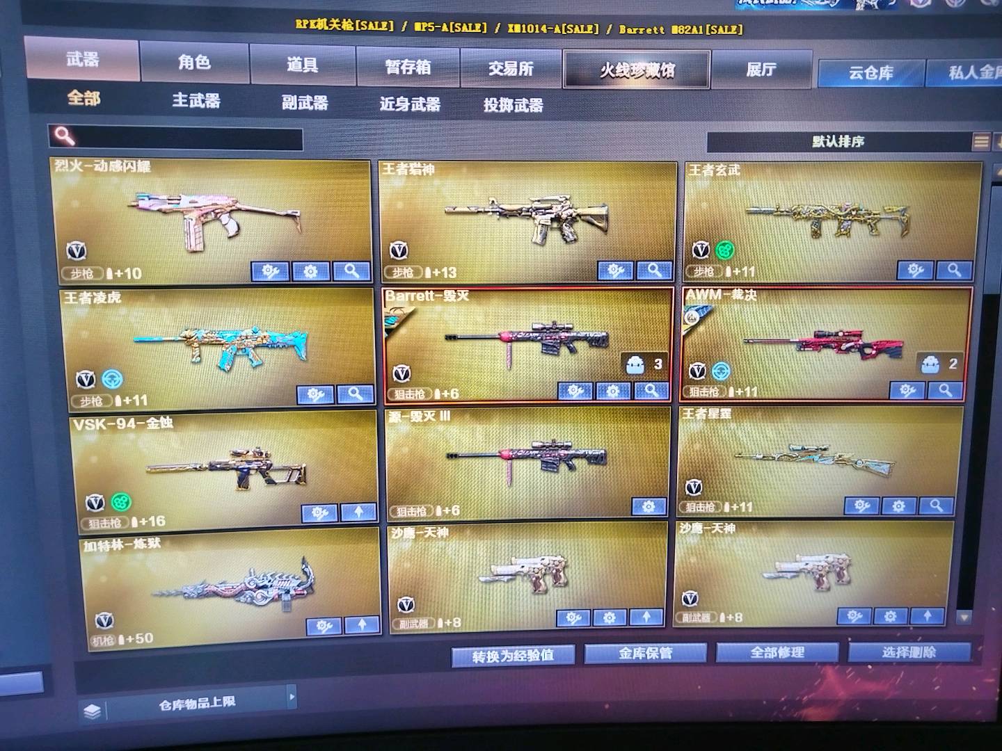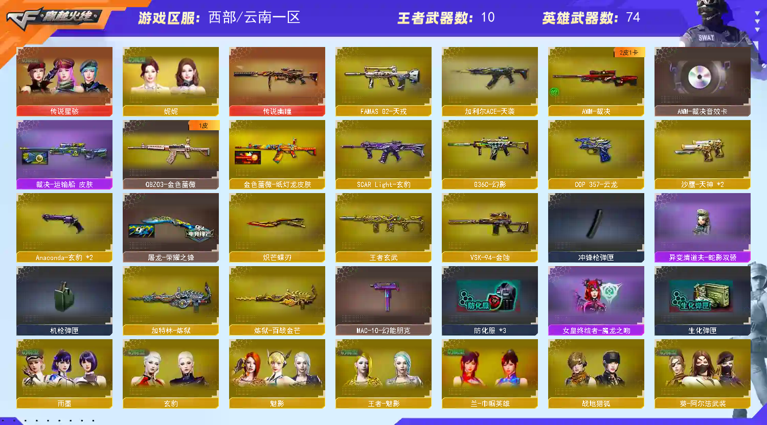 加利尔ACE-天袭 FAMASG2-天戒 玄豹套装 传说星骇 传说幽瞳 G36C幻影 王者星霆 幻神魅影 VSK-94-金蚀 裁决+音效卡 王者玄武 王者凌虎;炽芒蝶刃,传说星骇,妮妮,QBZ03-金色蔷薇,传说幽瞳,G36C-幻影,加利尔ACE-天袭,