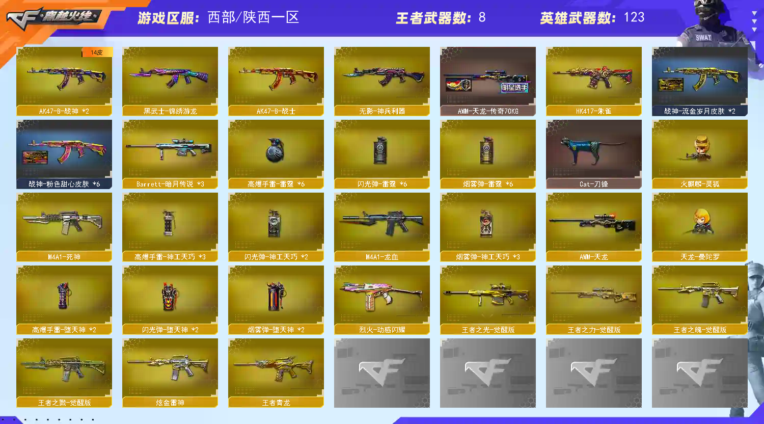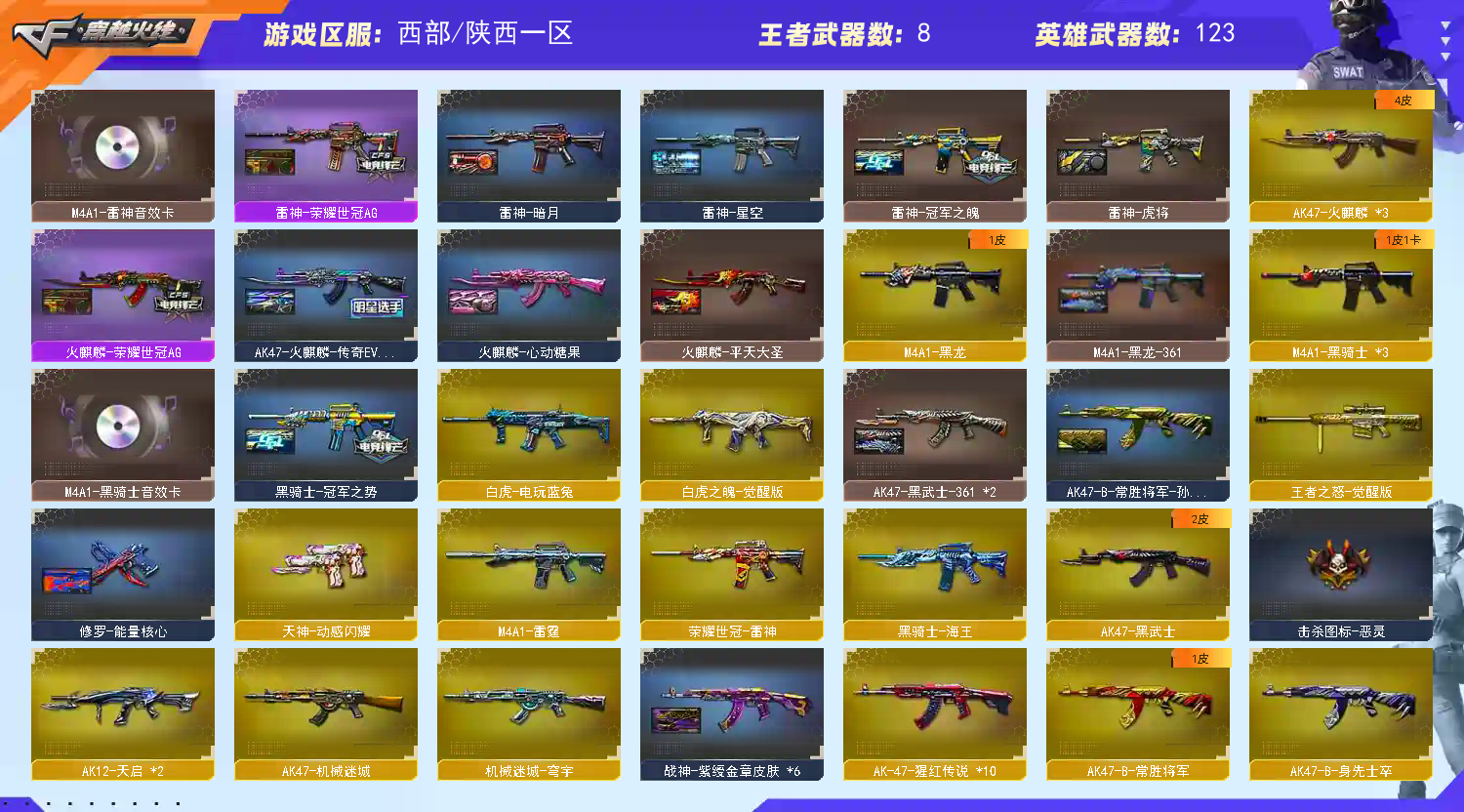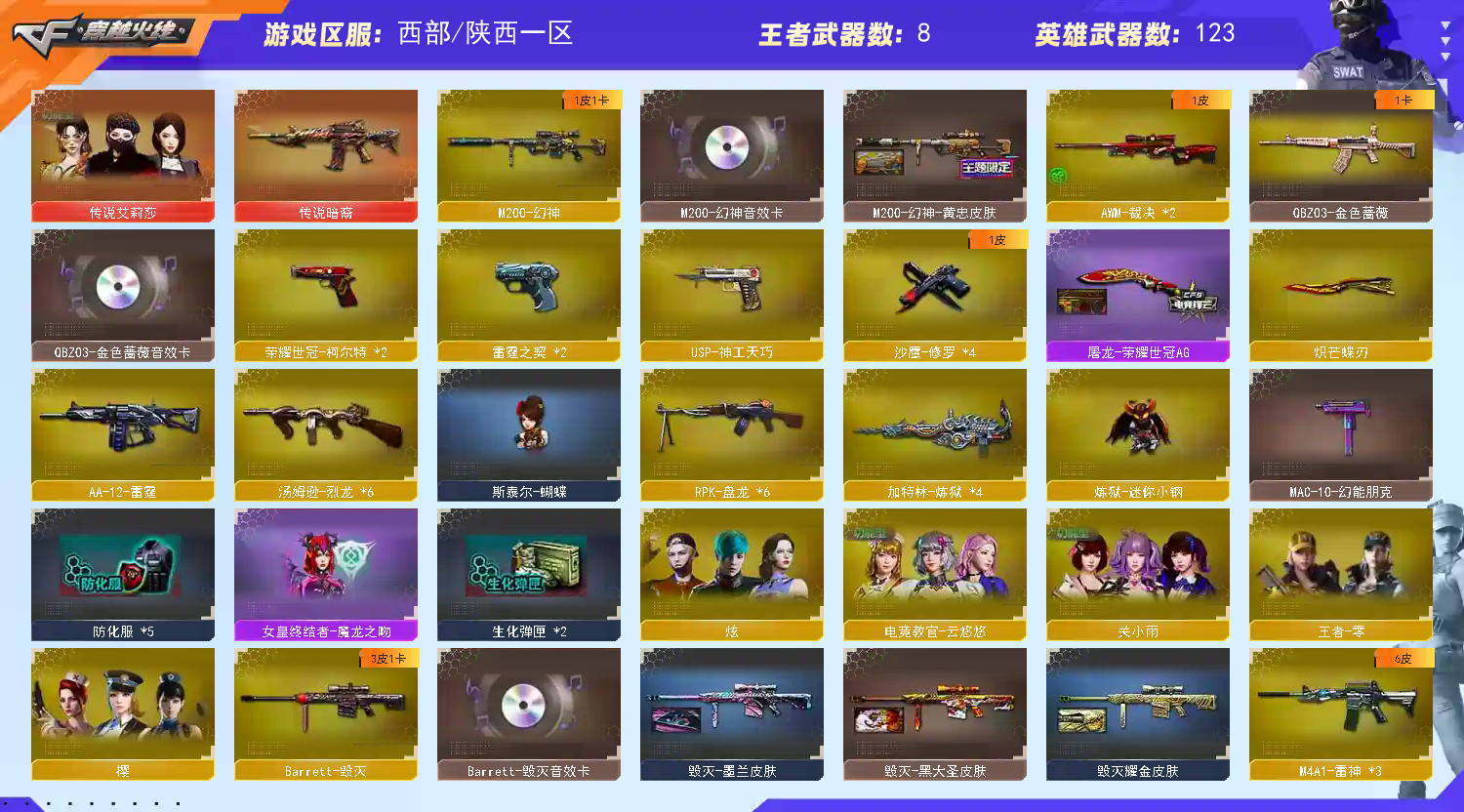 可排位 135v vip6[四防传说艾莉莎传说暗裔] [m200-幻神 幻神音效卡 幻神-黄忠] [炽芒蝶刃][白虎之魄 白虎-电玩蓝兔 hk417-朱雀] [qbz03-嘉年华柯基qbz03-金色苦薇 金色苦薇育效卡] [barrett-毁灭 毁火音效卡 毁灭-黑大圣] [m4a1-雷神 雷神音效卡 雷神-冠军之魄] [m4a1-黑骑上 黑骑上音效卡 黑骑上-冠军之势] [6盘龙 6烈龙 斯太尔-蝴蝶炼狱 迷你小刚] [cop357-雷霆*2 usp-雷暴 荣耀世冠-柯尔特][火麒麟 火麟-传奇even] [四防传说艾莉莎 四防云悠悠 管效益 新海豹突击队 炫 王者季 乔伊教练 王者季 樱] awm-裁决 m4a1-黑龙 我身 黑武士 天启 机械迷城 龙血 m4a1-雷霆 烈火 王者之魄 王者之戳 荣耀世冠-雷神 王者青龙 王者之怒 王者之光 王者之力barrett-暗月传说 aa12雷霆 修罗 居龙 警天 静刺尼泊尔-雷霆麒刺天神 龙啸天神 唐刀神工天巧 荣耀世冠-龙啸 等一系列武器加道具;荣耀世冠-柯尔特,炽芒蝶刃,电竞教官-云悠悠,传说艾莉莎,RPK-盘龙,QBZ03-金色蔷薇,M200-幻神,