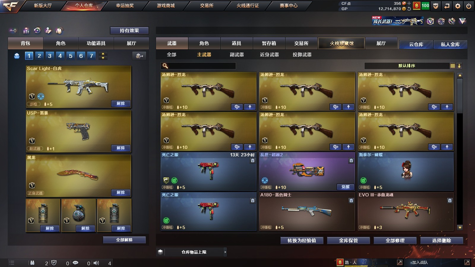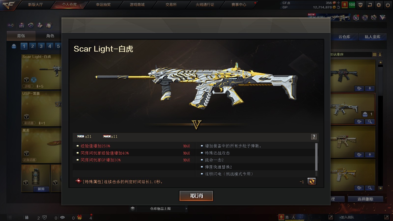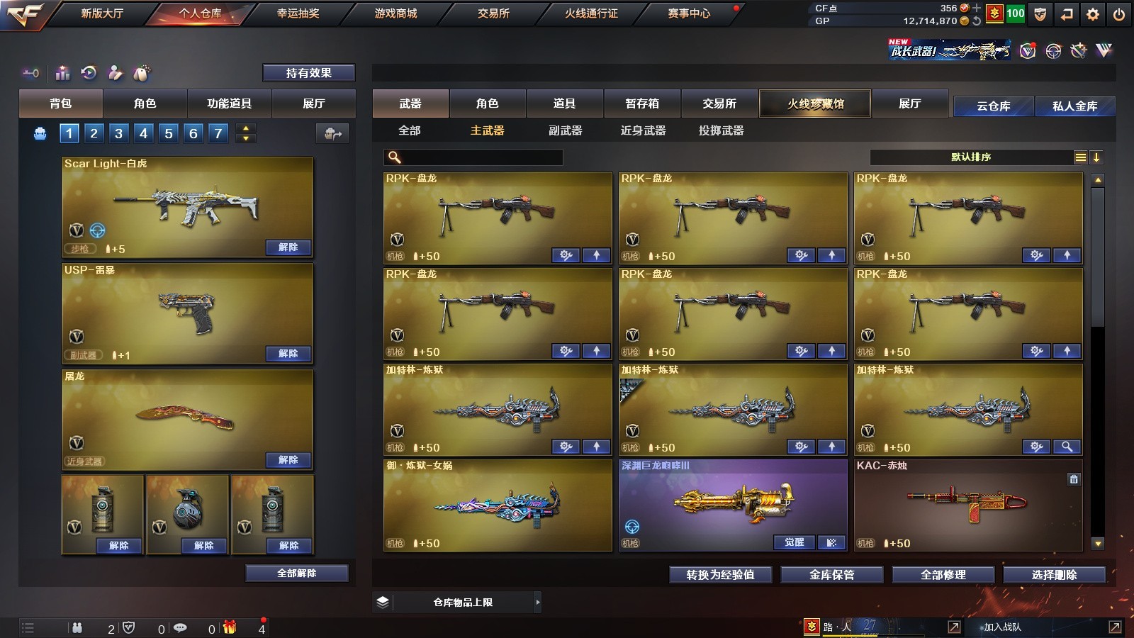 传说暗裔+USP雷暴丨QBZ蔷薇白虎朱雀丨雷暴套丨生化6盘6烈+炼狱蝴蝶;USP-雷暴,RPK-盘龙,QBZ03-金色蔷薇,Scar Light-白虎,传说暗裔,