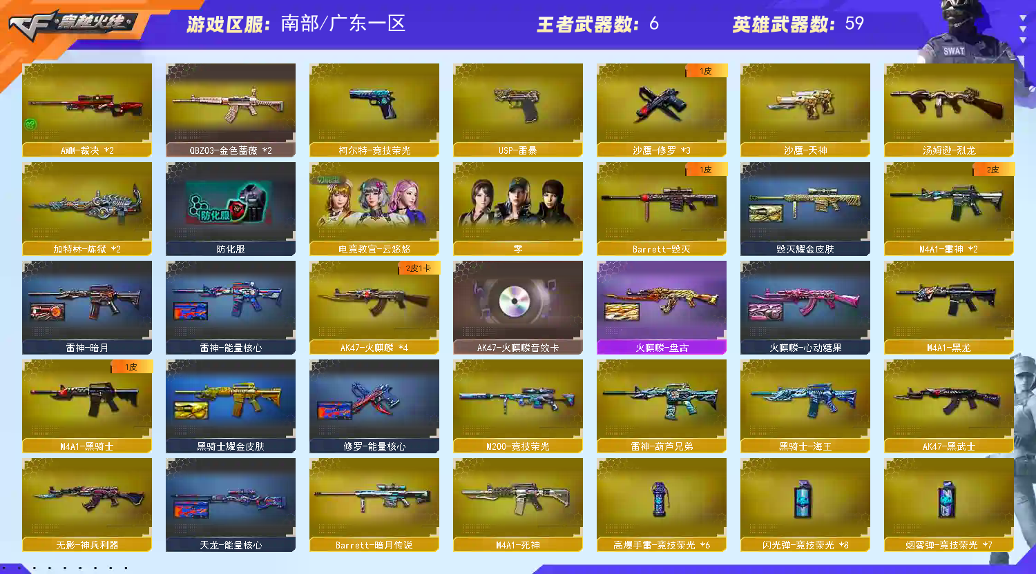 64V15王荣光幻神雷暴USP荣光柯尔特QBZ蔷薇+觉醒王者炎心火魄丨火麒麟盘古+音效竞技套云悠悠+;USP-雷暴,电竞教官-云悠悠,QBZ03-金色蔷薇,