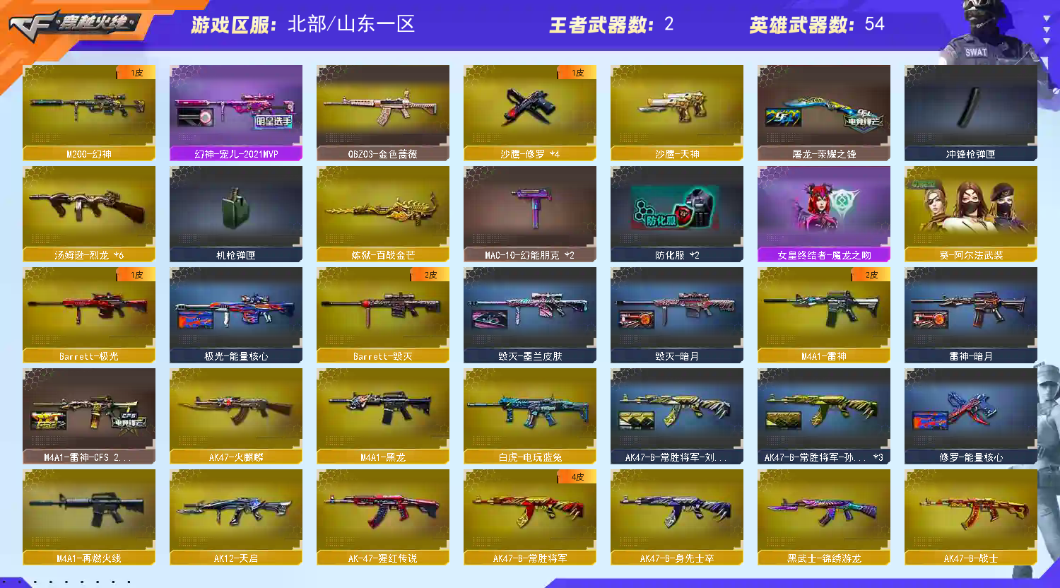 【亮点解析 北部精品生化号 幻神带宠儿皮肤】【m200幻神+宠儿皮肤】【星神长生圣莲】【6烈龙】【qbz金色蔷薇】【火麒麟+cfs2018】【黑龙】【雷神】【毁灭】【极光】 【武器:天启 白虎电玩蓝兔】 【手呛:修罗*4 沙鹰天神 】 【刀具:屠龙 麒麟刺堕天神 幻灵之峰 王者之击】 【雷套:幻灵雷*2 堕天神雷 竞技荣光雷】 【小人呛:天龙曼陀罗】 【音效卡: 】 【四防角色:职业经理】;QBZ03-金色蔷薇,M200-幻神,